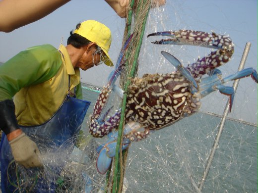 於是測完風向、看準海流、魚網上綁好磚頭. 咱們放網抓它去. 說也奇妙. 業績還真不錯. 等了大約半個小時後. 果真有了6、7隻的花蟹. 而且體型皆在中型以上. 可愛的吶~ 現在很多台灣的漁民. 也漸漸都有保育的觀念.