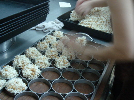 再倒入一個方型的大模具裡,用桿麵棍將米香桿實