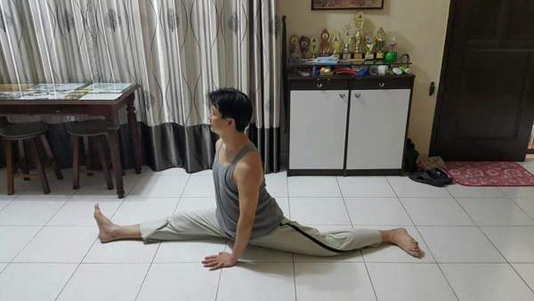 一字馬則是遲至46歲時才真正開始練壓腿拉筋的(回想一下,好像是宿舍的床有點太短,所以沒去想練這一式)。 剛開始時只能用單腳練九十度壓腿,接下來則逐漸把腳前伸,每天重複一點一點地增加張開的角度。 因年紀偏大,筋骨僵硬,柔軟度近乎零。 身邊沒幾個人看好這位欲挑戰不可能之任務的大叔我,都勸我早早放棄,免得受傷就慘了!
