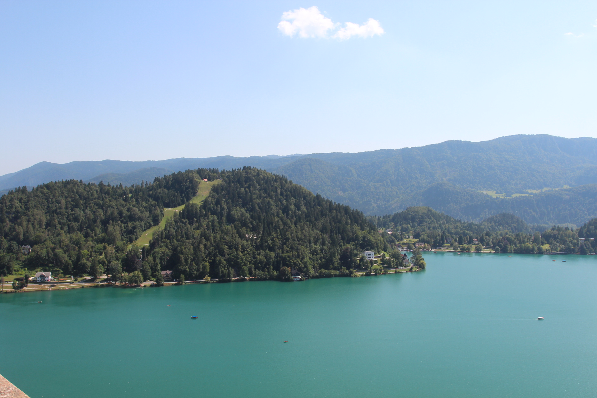 ▲往西南方看,水色依然深翡翠綠,山坡上淺綠的一道草坡,是冬季的滑雪道。布蕾德湖曾前後四次,做為世界划船錦標賽(World Rowing Championship)的比賽場地,最近一次是2011年。