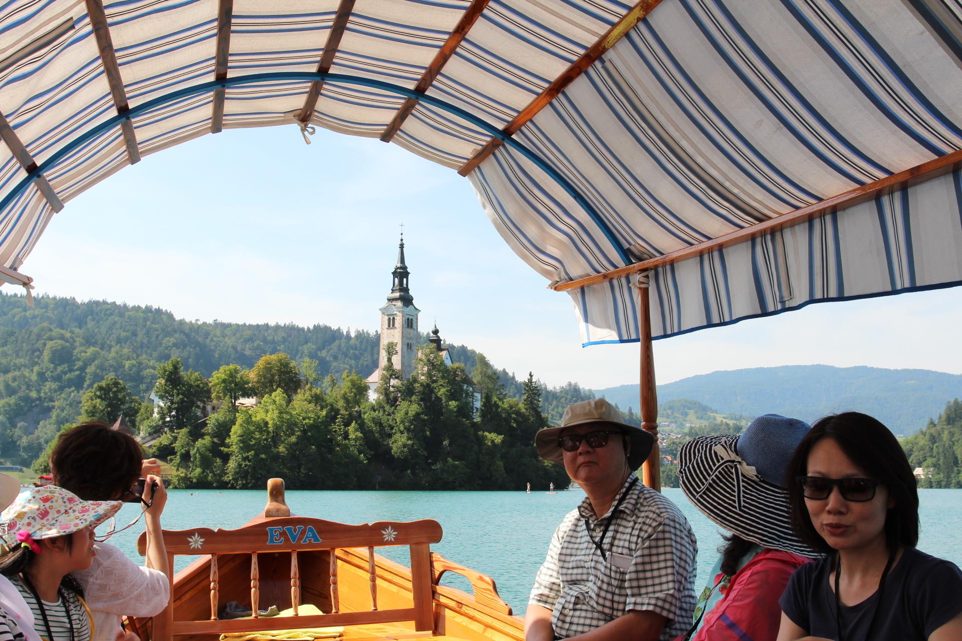 ▲▼搭當地稱為Pletna 的人力划槳平底船,划向布蕾德島,從船上眺望小島及教堂。Pletna源自德文的Pletten(平底船),從哈布斯堡王朝泰瑞莎女王(Empress Maria Teresa,1718~1780) 時代,湖南岸的Mlino村莊中有22戶人家得到官方特許,經營這種擺渡行業,且是世襲。搭Pletna船收費不低,雖只三、四百公尺距離,網路上單人來回票價14歐元,可能跟世襲造成壟斷脫不了關係。