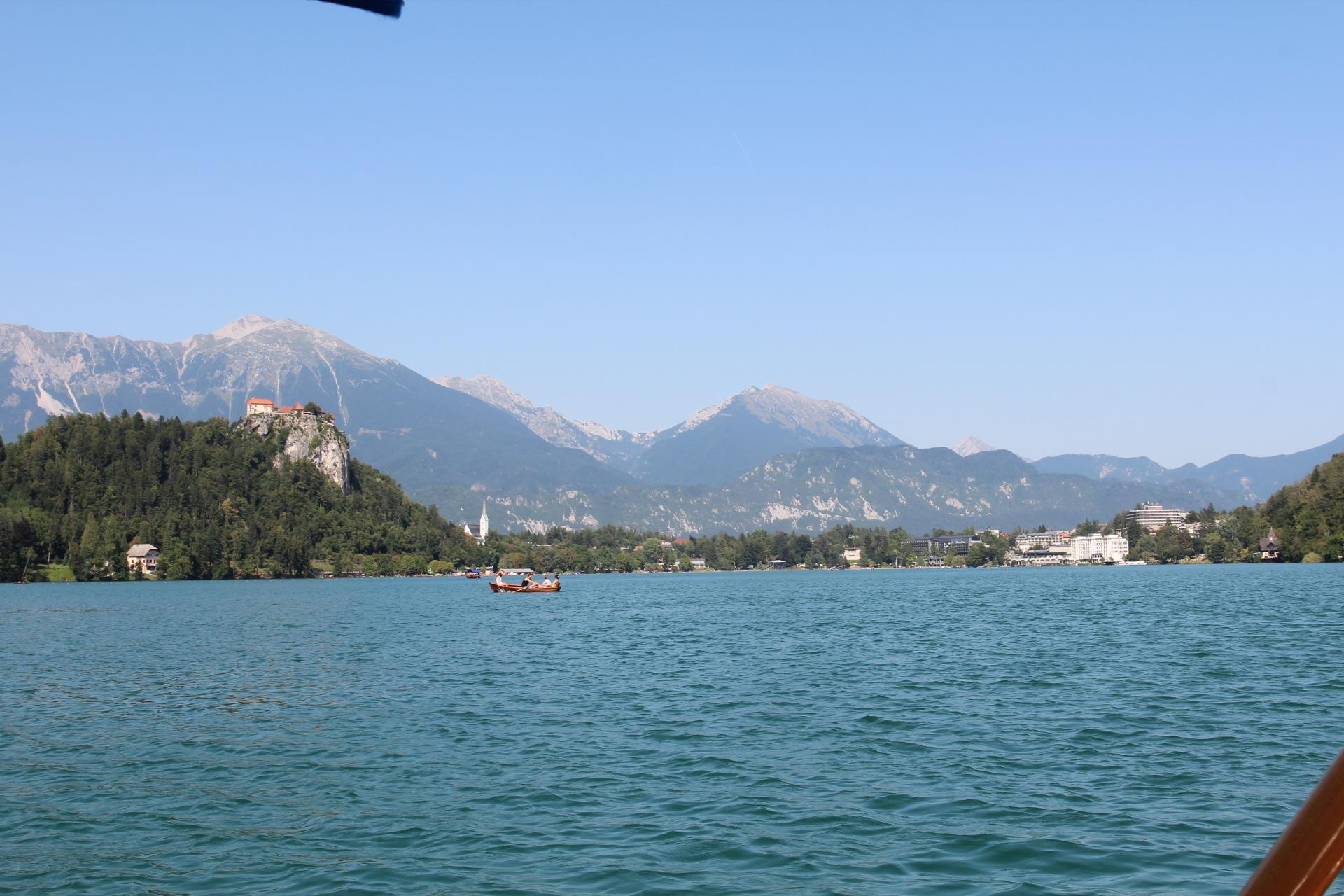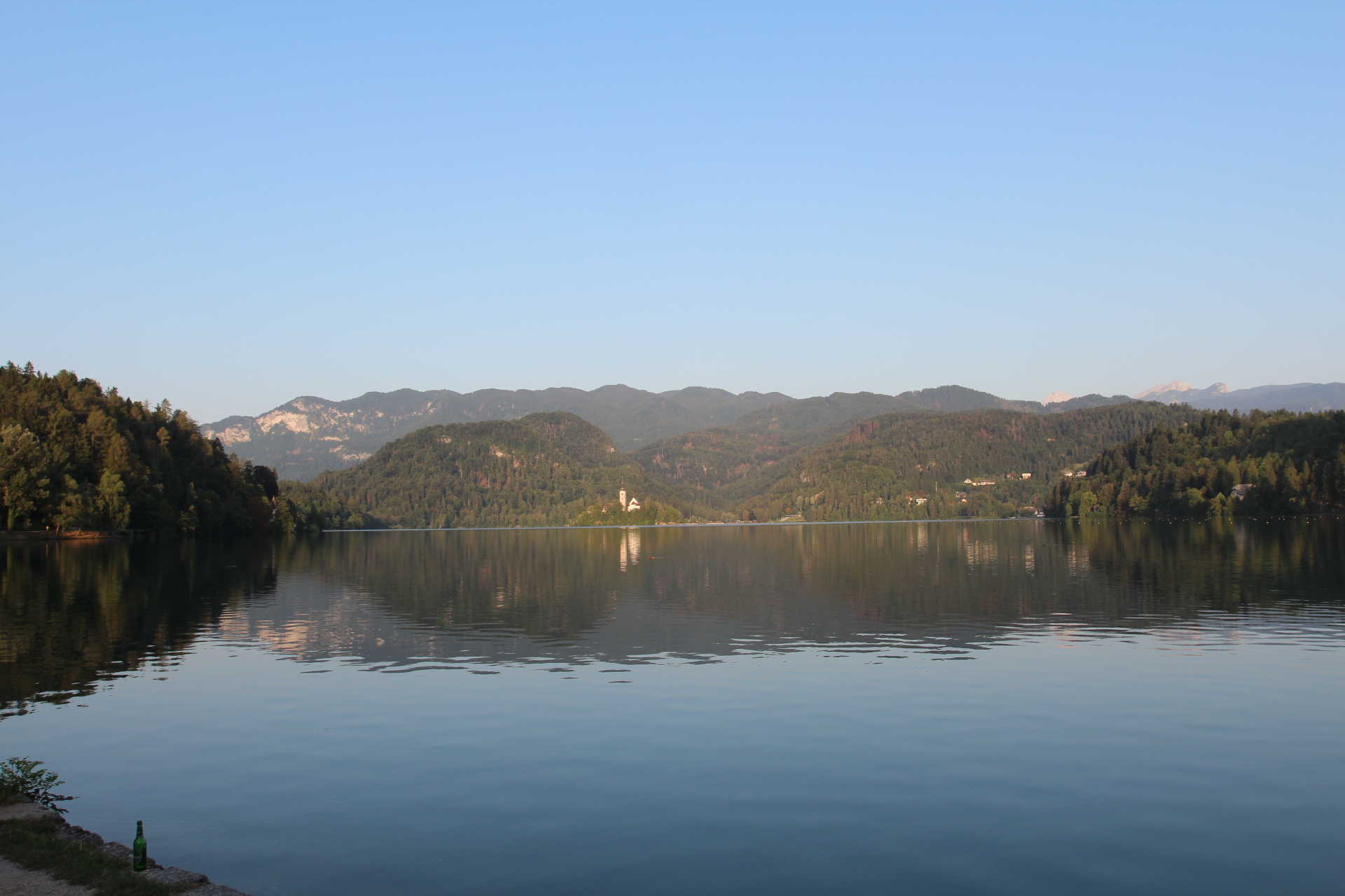 遠處石灰岩的山頂,光禿禿的裸露岩石,寸草不生。現在是農曆七月初秋,想必再過一兩個月,山頂上應該開始出現積雪,白雪在陽光中閃閃發亮,跟現在景觀迥然不同。出塵脫俗,靜謐詳和的布蕾德湖,那時湖面應開始結冰,景觀也會跟現在不同,儘管秋去冬來,時序更替,不變的是令人難忘的湖景。