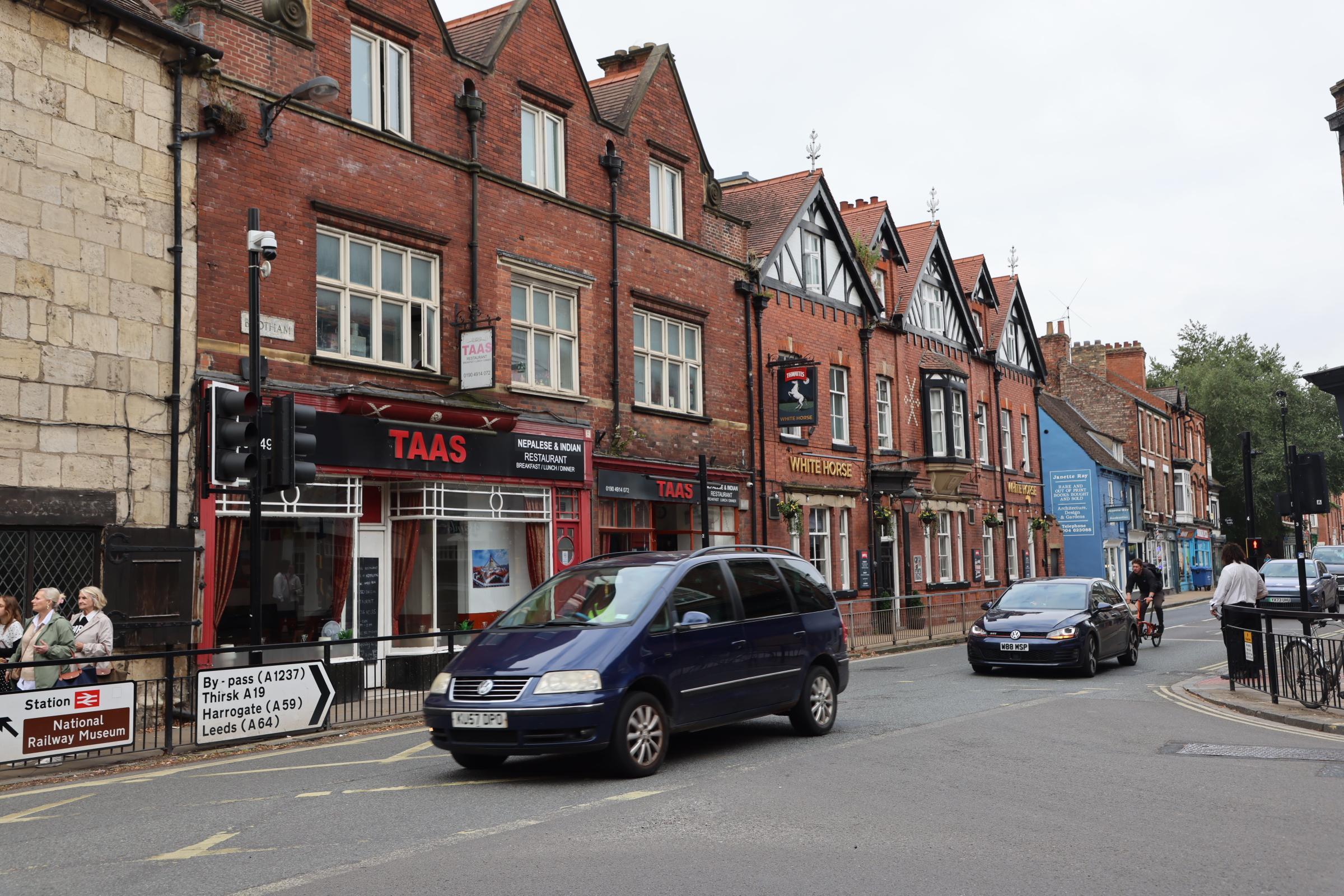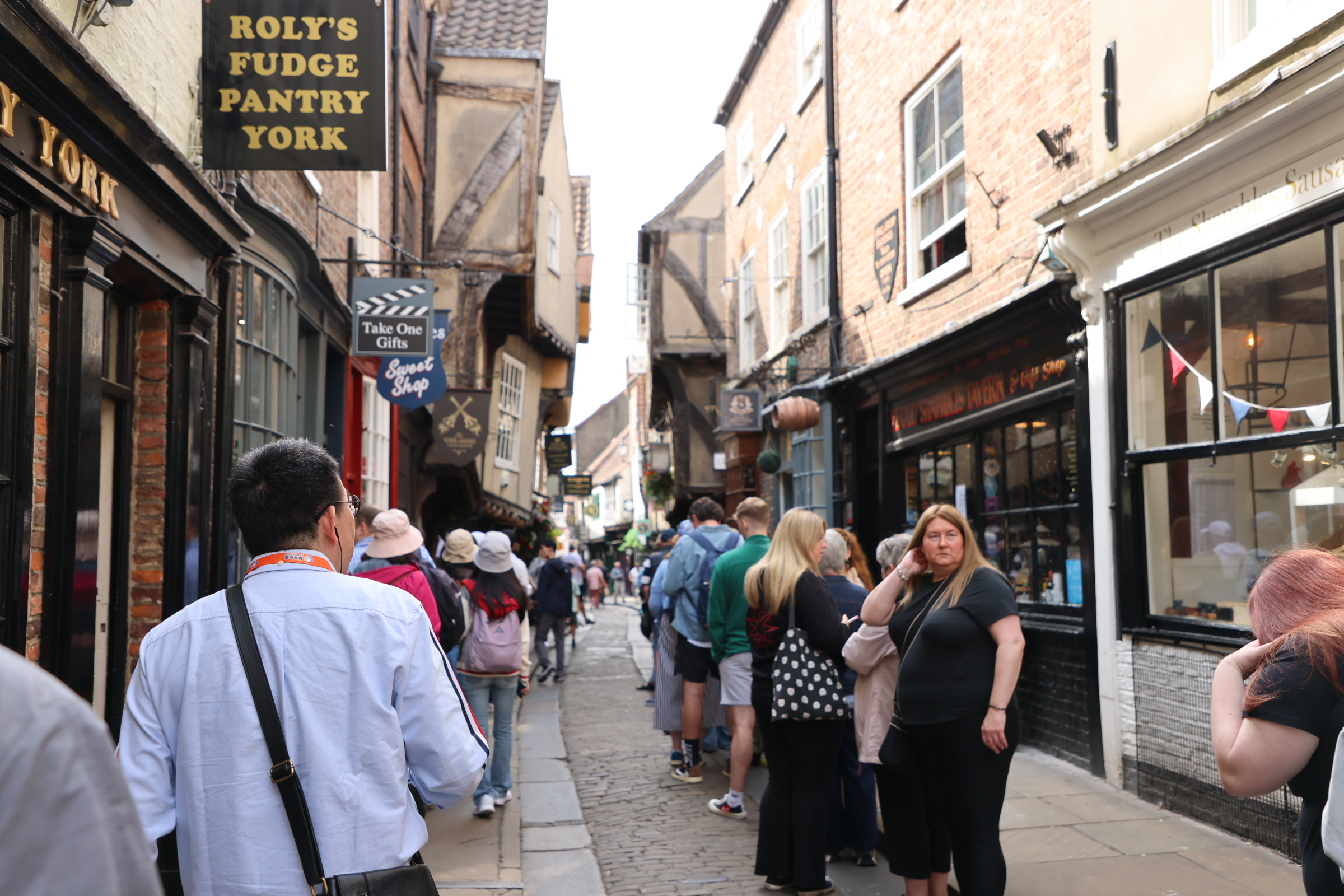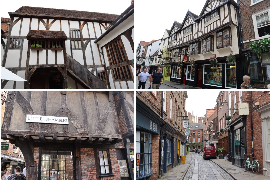 兩旁房屋一半以上是以木材為骨架,所謂的木桁架(Half-Timbered Building)建築,木頭上不難看出滿佈歲月的痕跡,令人起了不少思古之幽情,小巷兩旁販賣不同商品的商店一家接一家,大部分是紀念品、甜點糖果,服飾等,也有一家以「不能說的那家店(The shop that must not be named) 」為名,模仿指佛地魔(Lord Voldemort)的哈利波特紀念品專賣店,這條街叫香波街(The Shamble),意譯叫肉舖街,Shamble這個英文字源自盎格魯撒克森語的Shammei,意思是肉販擺肉的長條桌子,根據記載1885年時香波街有31家肉舖,想必當年空氣中應都可嗅出生肉的味道,現在倒已消失殆盡,一家都看不見。