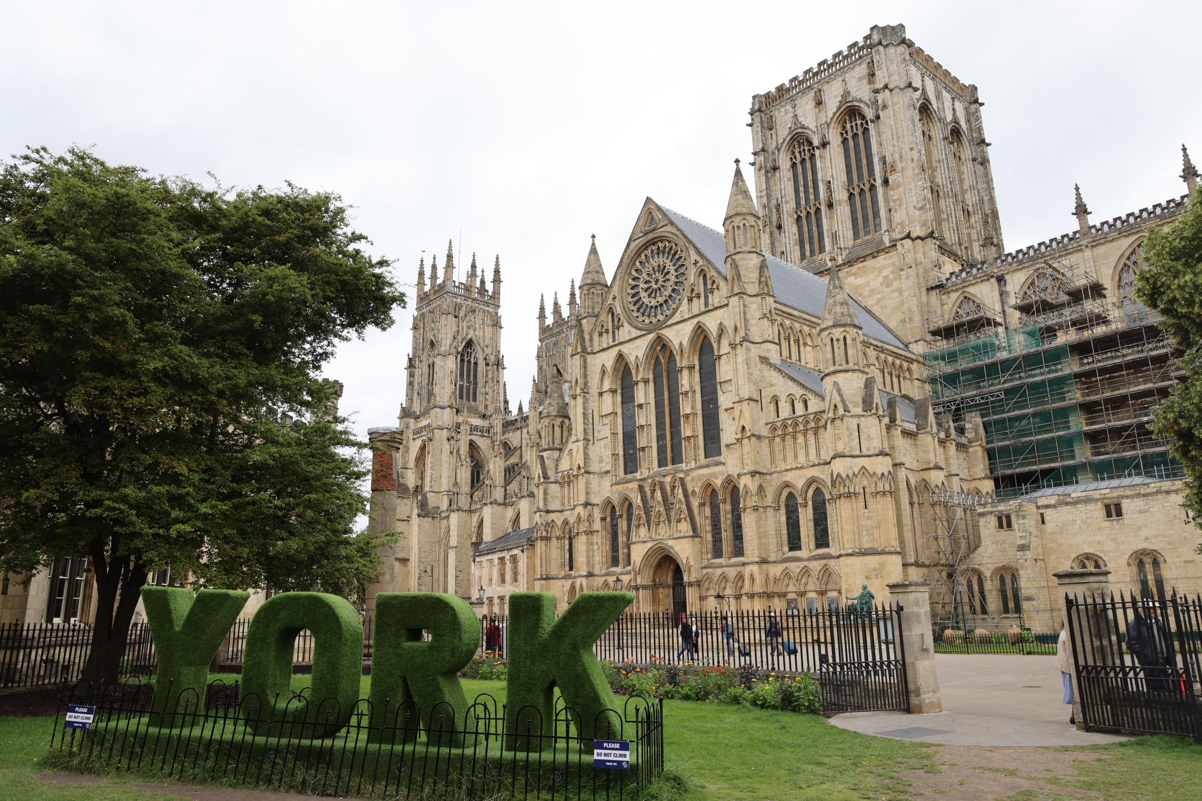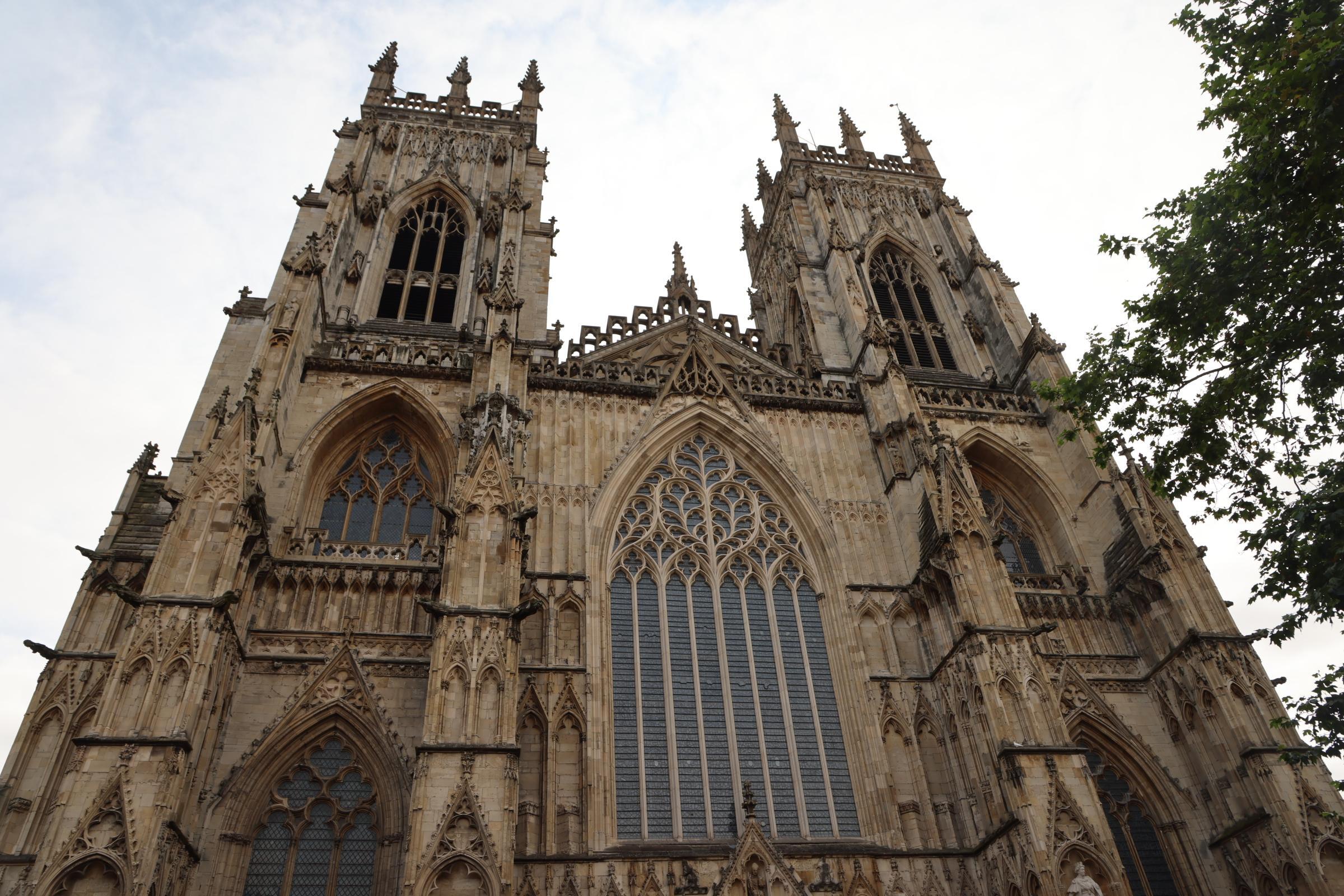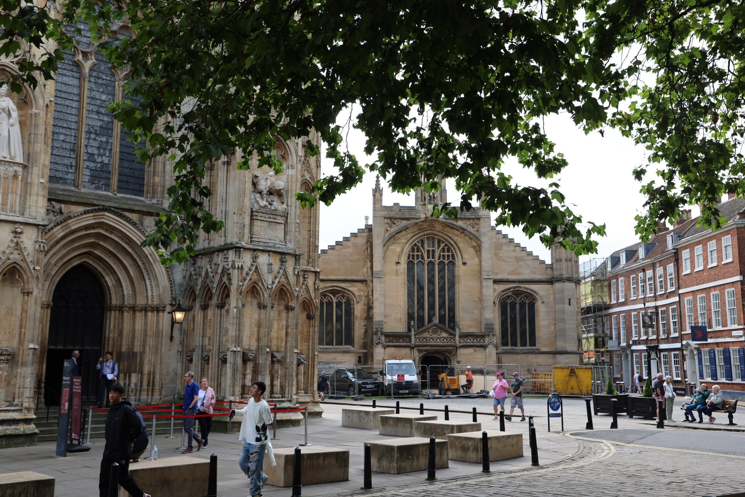 從布善門走進來,沒多久映入眼簾的是壯觀的約克大教堂(York Minster),創建於1220年,哥德式建築,氣勢非凡,塔樓聳立,精緻的雕刻,和華麗的玫瑰花窗,是英國最大、也是最精緻的教堂之一,教堂正面還鑲嵌有2023年過世的英國女王,伊莉莎白一世的塑像;我們熟知的歷史,英格蘭都鐸王朝的第二任國王亨利八世(Henry VIII,1491-1547),為了與原皇后離婚,另娶新皇后,與當時羅馬的教廷鬧翻,脫離天主教會,另立英國國教,即英格蘭教會(The Church of England),英王並兼任國教的最高領袖,其首席主教是坎特柏里大主教(Archbishop of Canterbury),座堂是坎特柏里大教堂(Canterbury Cathedral)。副首席則是約克大大主教(Archbishop of York),座堂是約克大教堂。