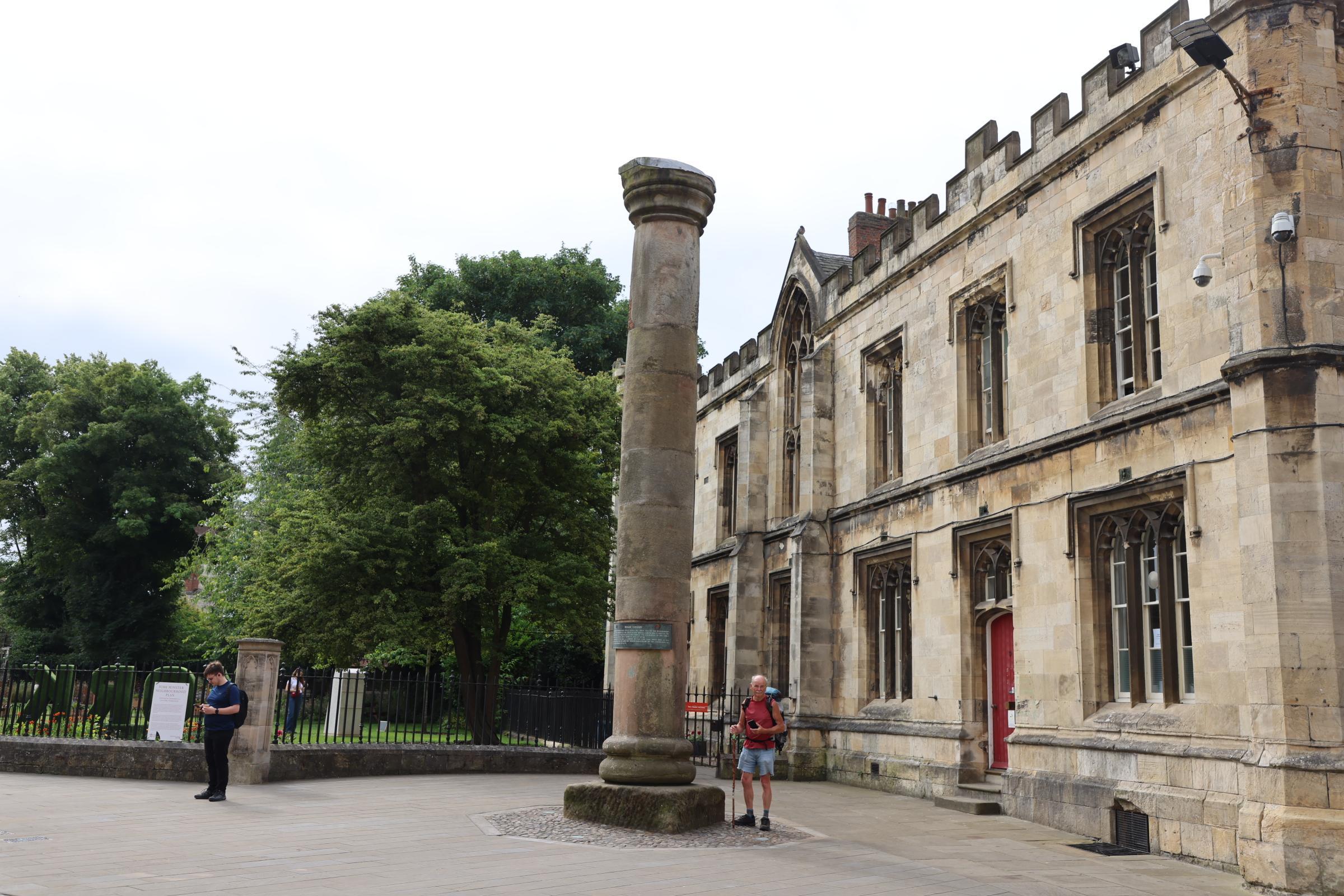 ▲▼約克大教堂南側門附近的君士坦丁大帝塑像(上),碑文註明西元306年稱帝,及南側門不遠的羅馬柱(下),原立在羅馬軍團的總部,後倒塌,1969年被挖掘出來,1971年,慶祝約克建城1900年時,重新立起來。