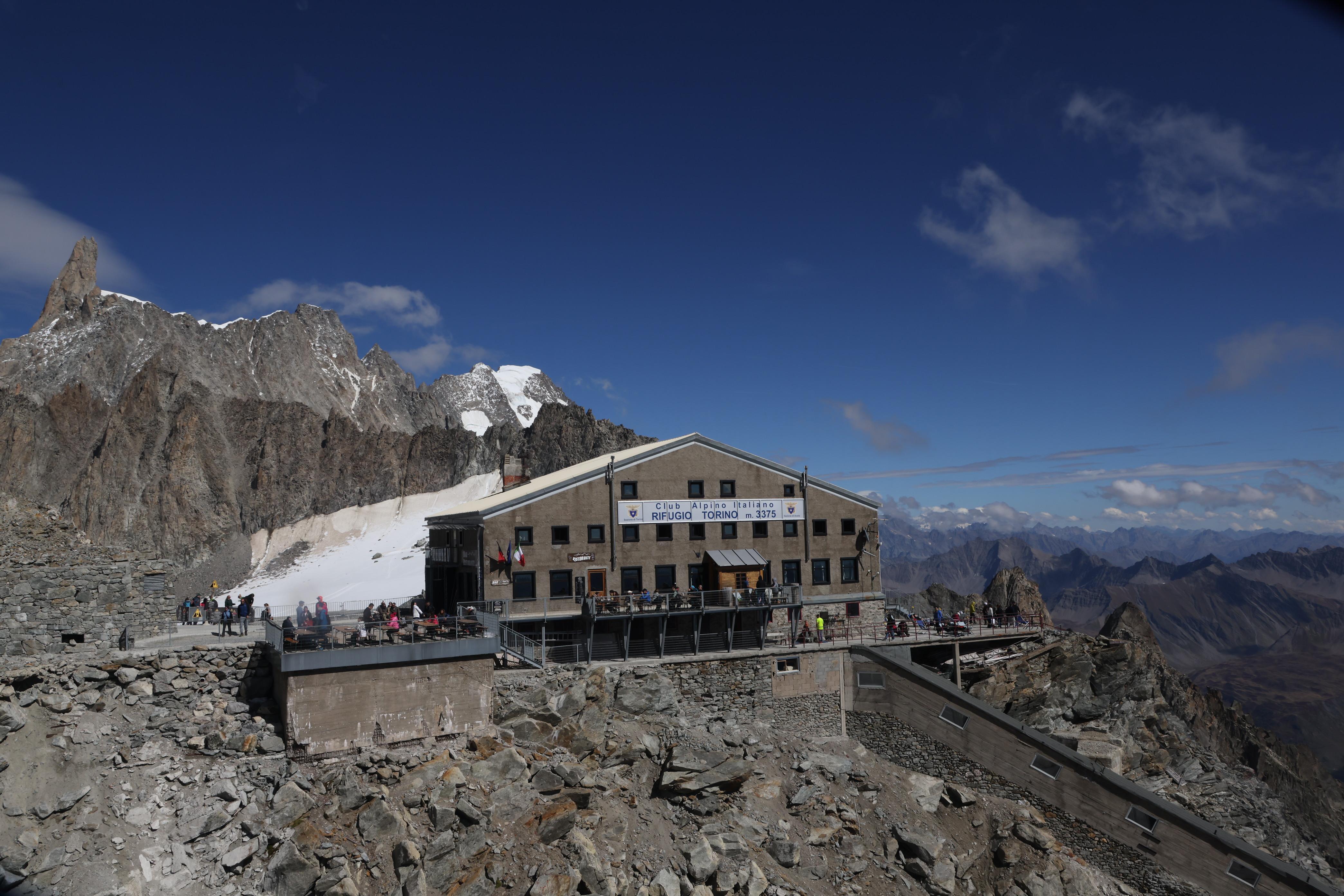 ▲杜林山屋(義文:Refugio Torino),白朗峰纜車快抵達赫爾布羅納峰纜車站前,面向纜車站右手邊的建築,海拔3375公尺,背倚巨人齒山(Dent du Geant),景色優美,是當地著名的山屋。因為由杜林的山友協會所建,故以杜林為名,除了提供山友食宿,夏季時山屋亦提供遊客餐飲,可由達赫爾布羅納峰纜車站,經山體中往下70公尺高的電梯抵達。
