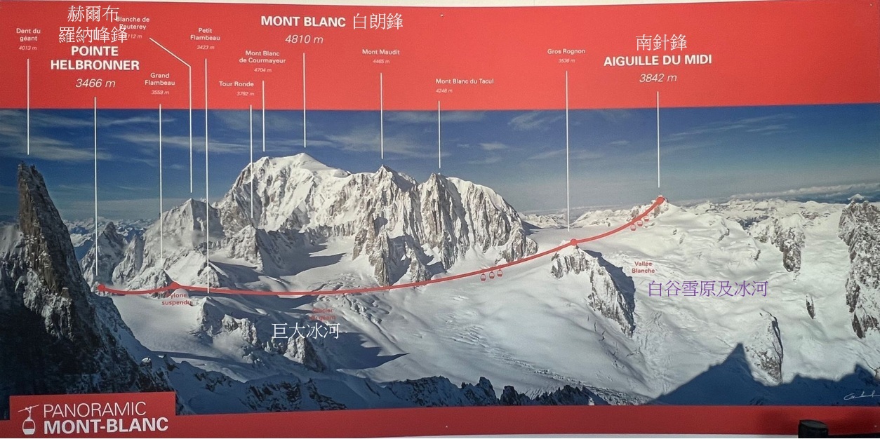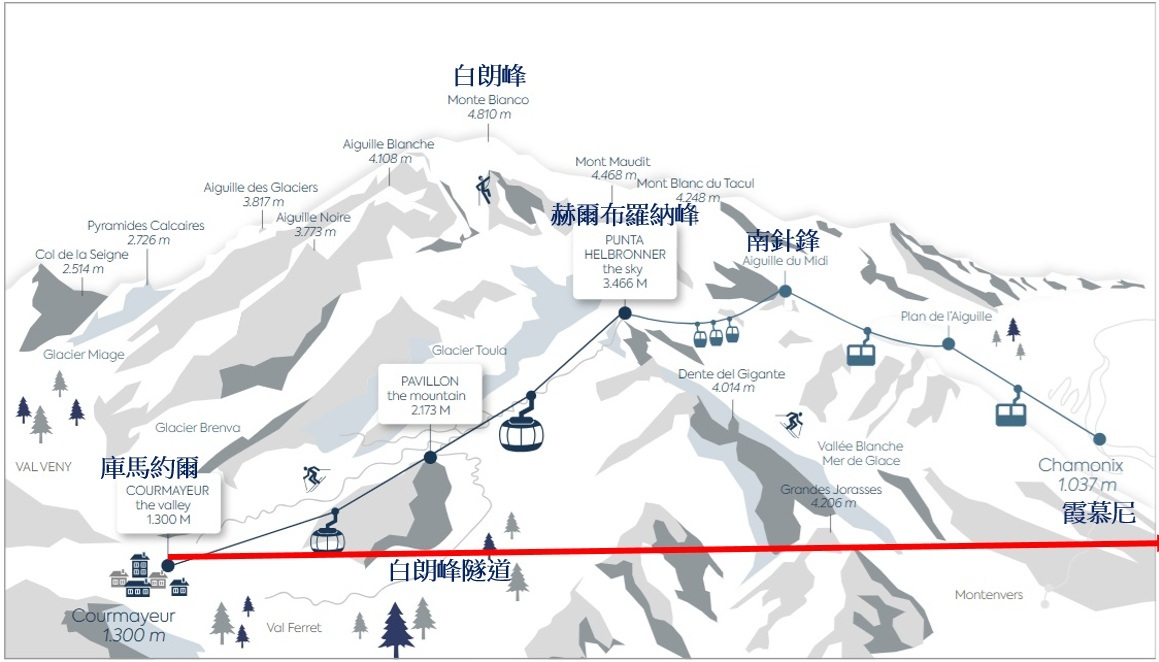 ▲從赫爾布羅納峰至南針峰,再至霞慕尼的纜車路線圖;紅色是白朗峰隧道,長11.6公里,1965年完工啟用,隧道義大利端入口,就在Entreves纜車站的上方。