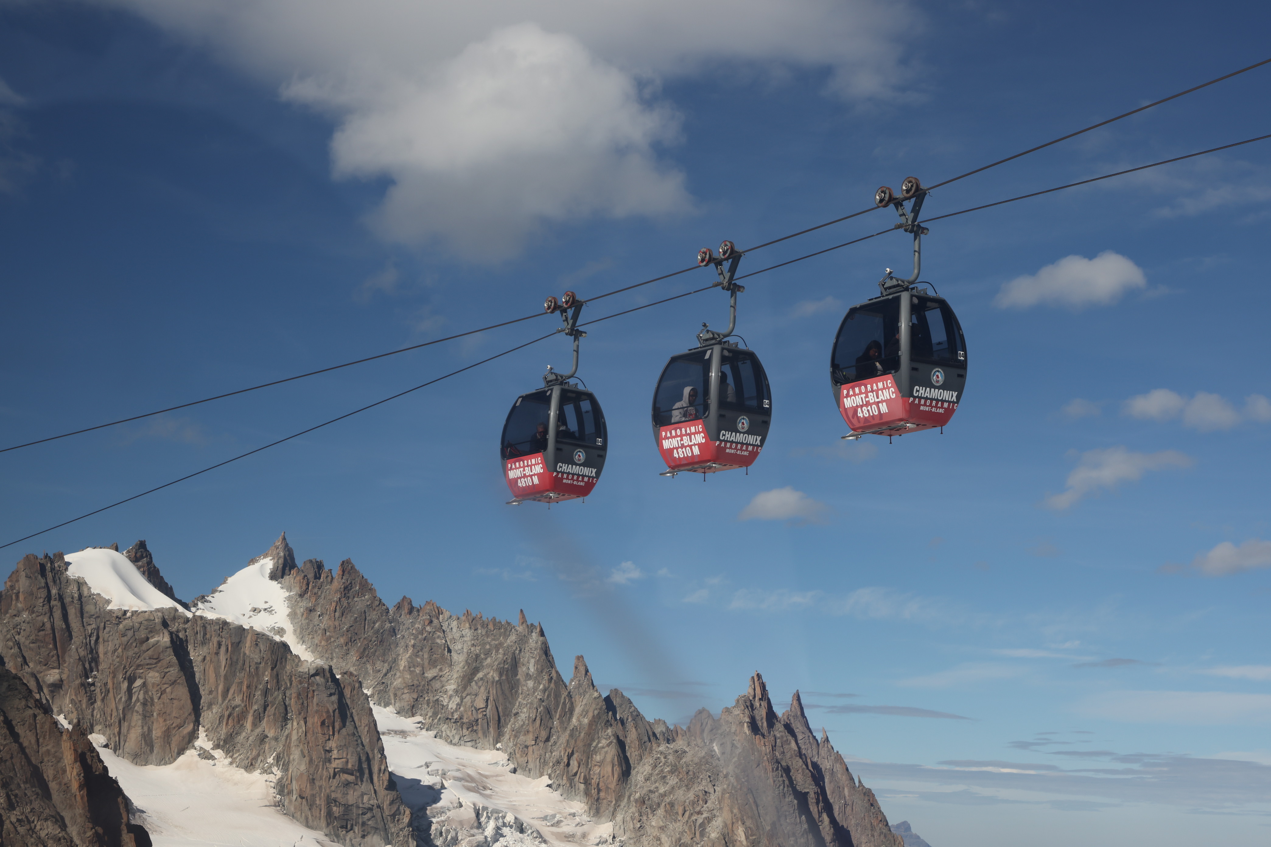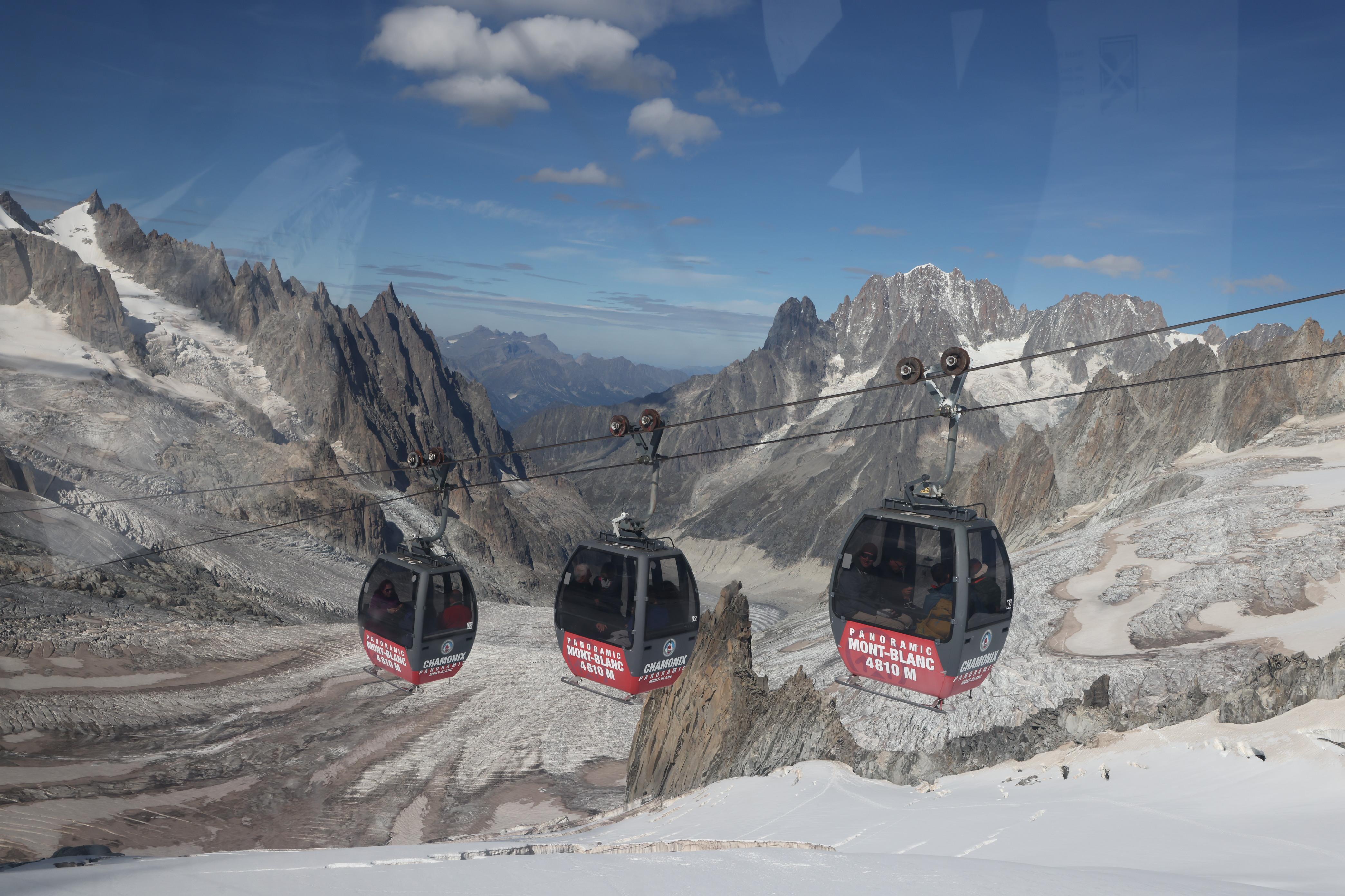 ▲由杜林山屋所見白朗峰纜車的車廂,2015年才啟用,還蠻新的。纜車車廂可容80人,在行程中會轉動一圈,讓遊客能看到360度景色。背景中間最高者即是白朗峰,(摘自纜車公司官網)