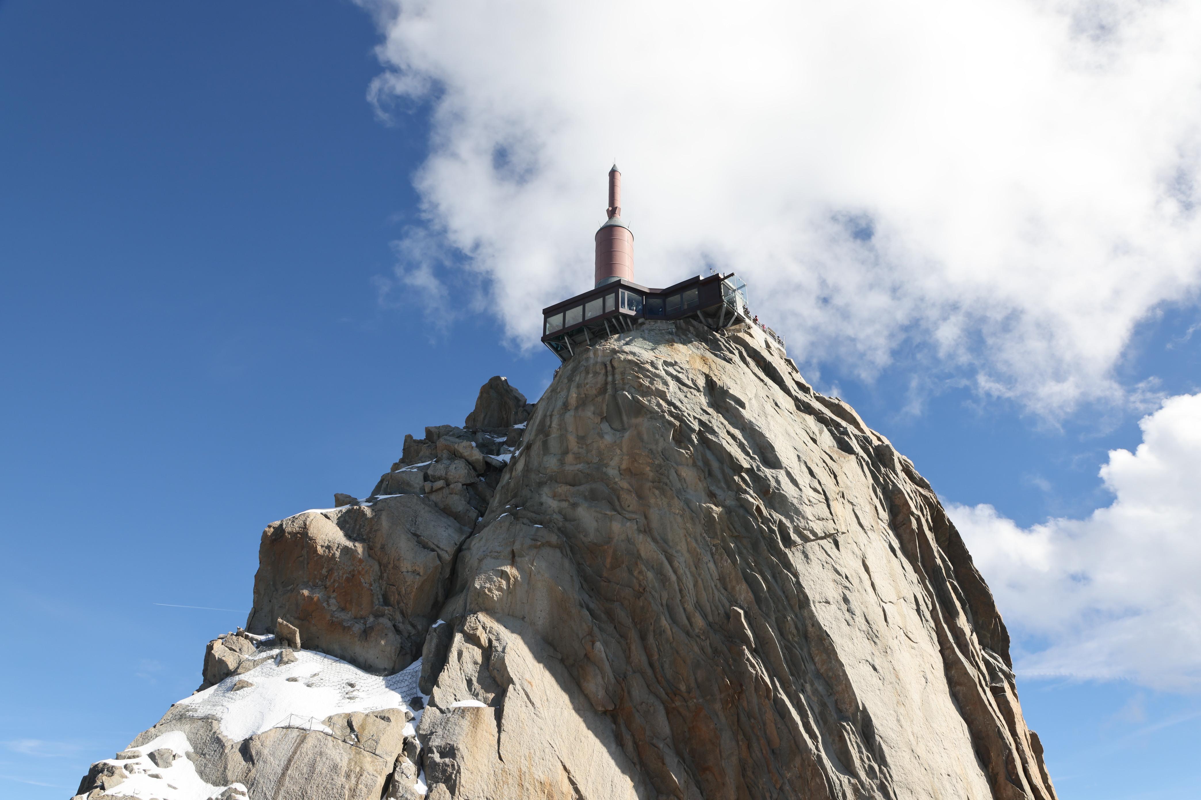 從霞慕尼市區仰望,南針峰山頂確實細如針;但近看其實是一根粗壯的圓柱狀天線。因前方還有座山,南針峰顯得陡勢稍緩;然而從赫爾布羅納峰搭纜車接近時,南針峰陡然拔起,幾近垂直,一柱擎天,落差極大,氣勢驚險許多。從南針峰遠眺白朗峰,是觀賞白朗峰最理想的地點與角度。與瑞士的兩座名峰相似,少女峰(Jungfrau)要從少女峰鞍部(Jungfraujoch)遠望,馬特洪峰(Matterhorn)則從高納葛拉特(Gornergrat)欣賞。若真能親登白朗峰頂,恐怕反而只覺「只在此山中,雲深不知處」。