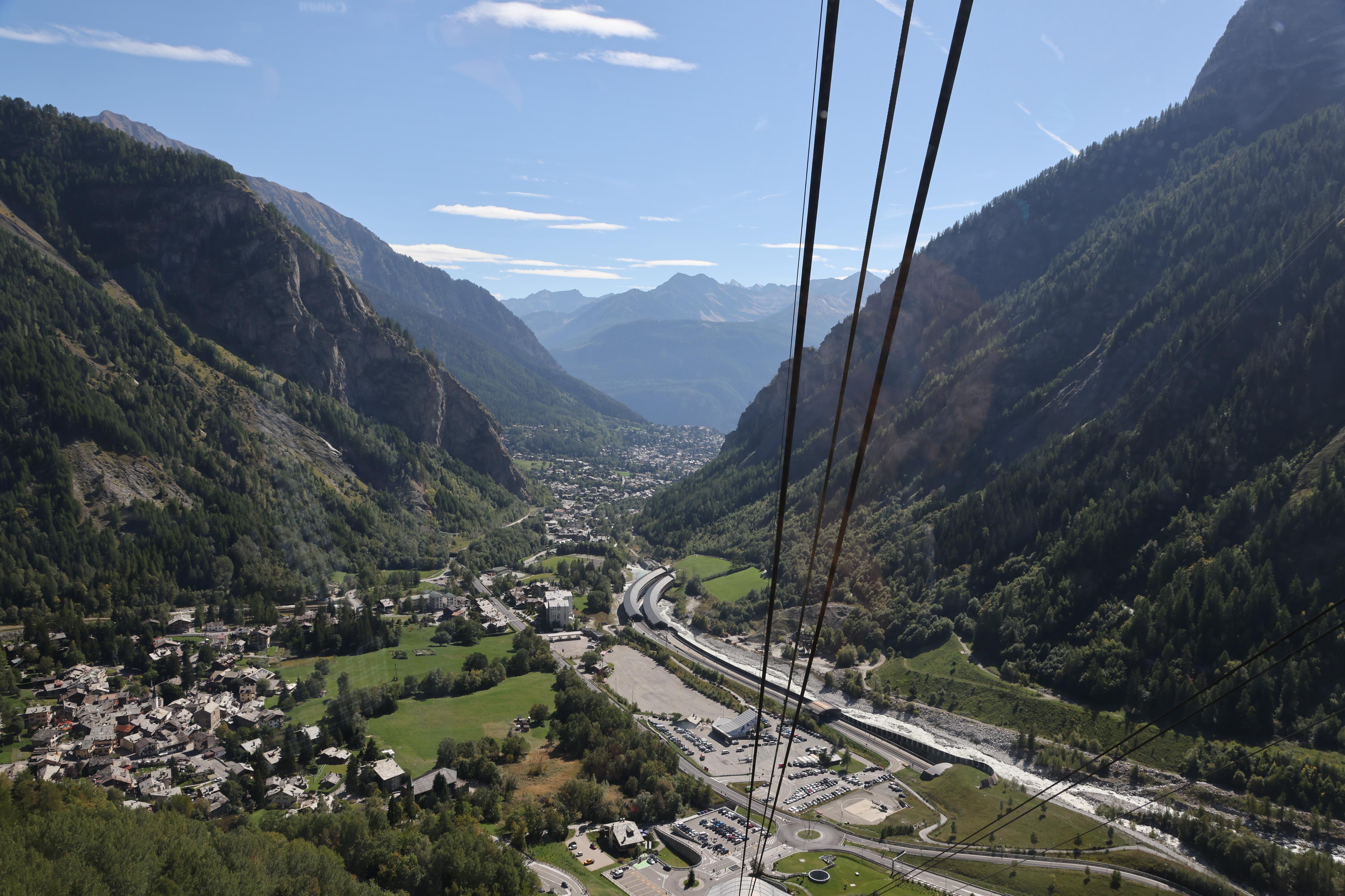 ▲▼白朗峰纜車纜車的Entreves車站入口(上),及抵達Pavillon站前所見的山谷景色(下),下圖右手邊那條路就是通往白朗峰隧道。