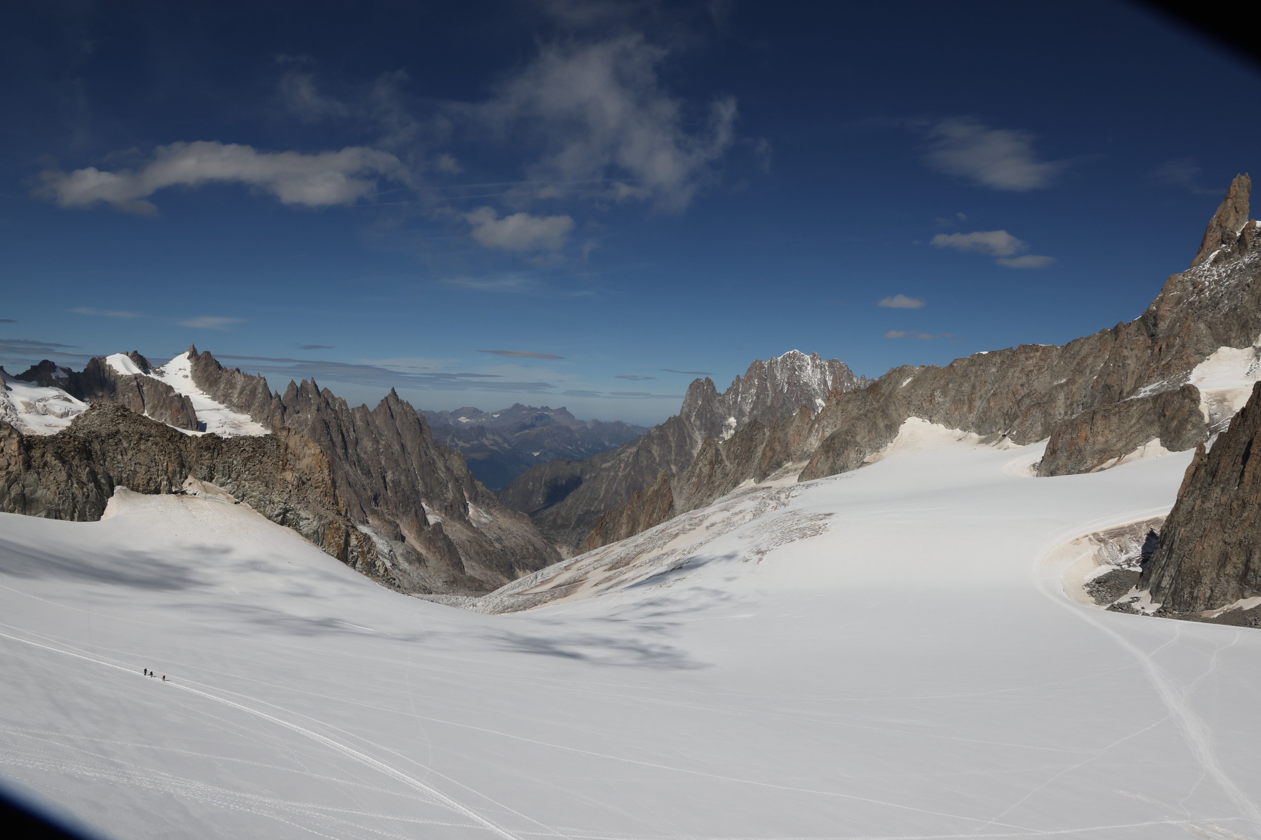 從纜車廂往下看,腳下就是冰河與覆蓋厚厚冰雪的山谷雪原。雪原上遍佈一道道深不見底的裂溝與洞穴。高山雪原,山勢陡峭,嶙峋如惡地,令人不免有些忐忑。纜車緩緩越過雪原與冰河,腳下是一片無聲的銀白,深邃的像時間靜止的世界。光線在雪地上折射,刺眼得幾乎讓人屏息。興奮在胸口翻湧,卻又被那無垠的寂靜擠壓成一股敬畏。遠處細若米粒的登山客,在雪原上緩慢移動,那份堅毅,讓人不由得肅然起敬。南北朝劉勰的文心雕龍有兩句:「登山則情滿於山,觀海則意溢於海」,強調寫作時應將情感融入景物中;這些登山者,在滿佈裂溝與洞穴的高山雪原,專注一心奮力往上攀登,也是另一種「登山則情滿於山」。此刻,在高天與寒地之間,渺小與壯闊並非對立,而是共容。
