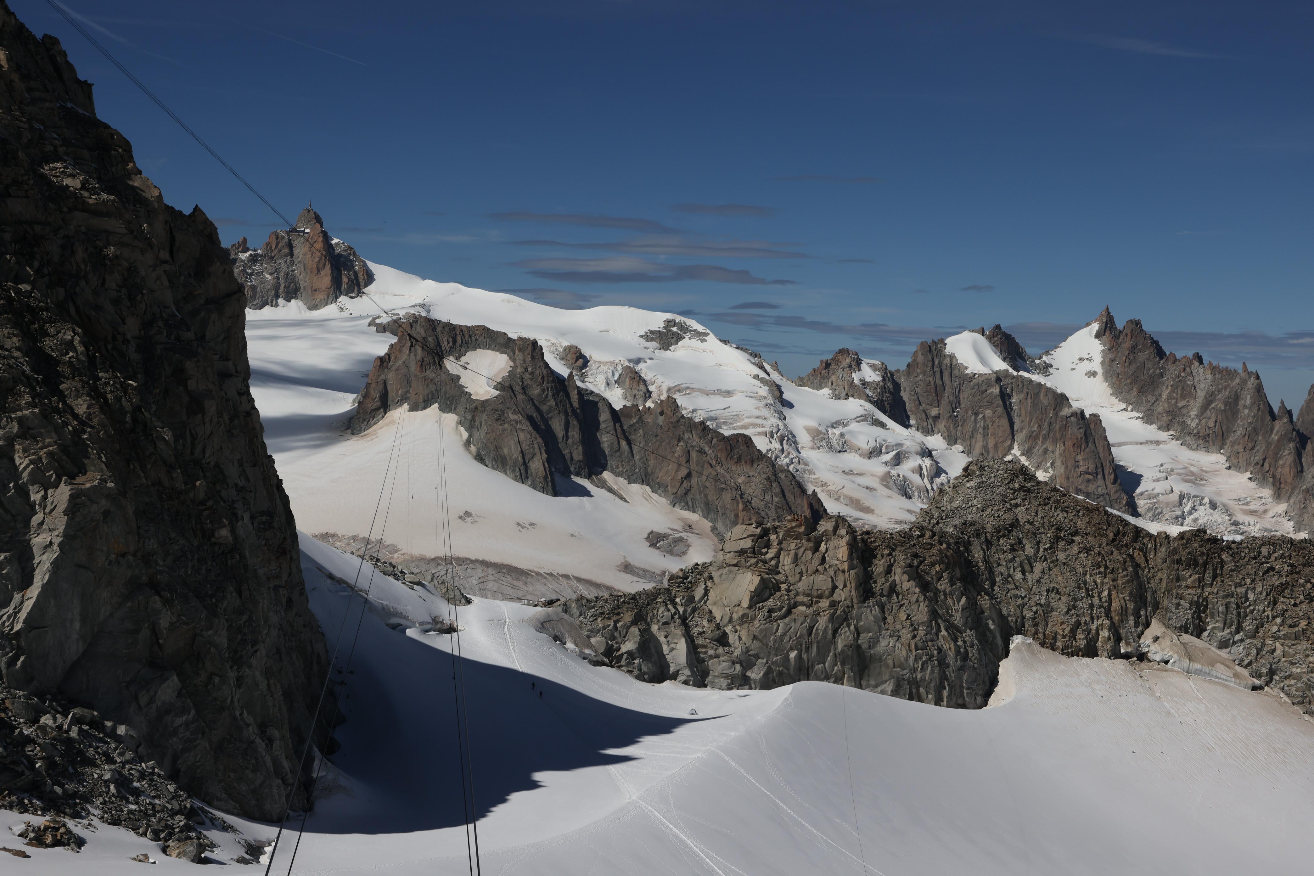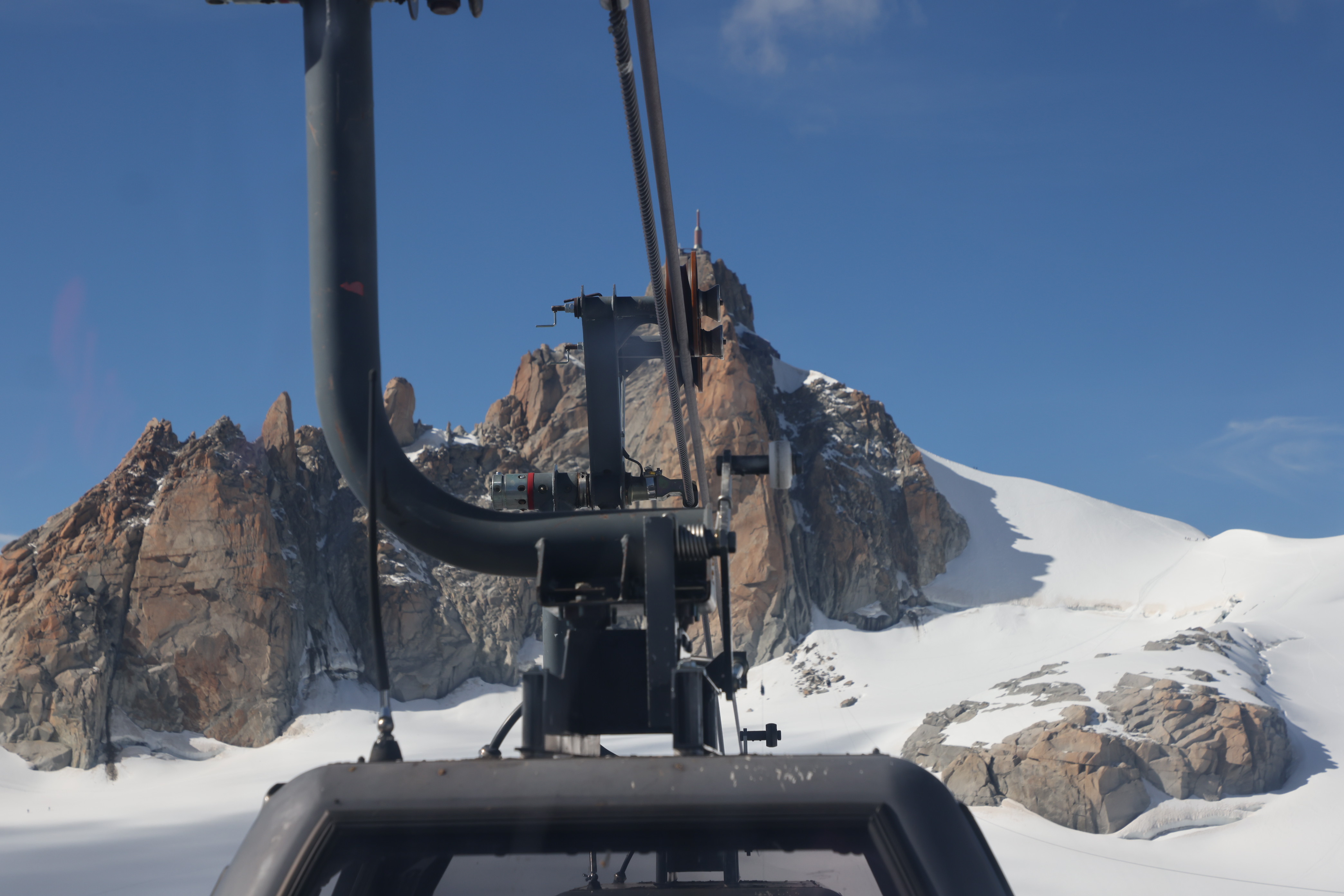 前述情景,是搭乘名為白谷纜車(Vallée Blanche Cable Car)時所見。該纜車從義大利境內,海拔3466公尺的赫爾布羅納峰(Pointe Helbronner)至法國境內,海拔3842公尺的南針峰(Aiguille du Midi),由法國的白朗峰公司(Compagnie du Mont-Blanc)營運,一組三個車廂,每個車廂可容四人。登南針峰,是為了從那裡遠眺西歐之巔、阿爾卑斯山最高峰—海拔4810公尺的白朗峰(Mont Blanc,白色山峰之意)。赫爾布羅納纜車站,建於法、義兩國邊境,出了纜車站即屬法國。纜車道全長約5095公尺,中途有兩個支撐點。速度不快,若風勢過大,纜車擺盪過度,便會暫停。每當停下時,車廂雖僅微微搖晃,但望著對向下山的纜車,懸在離地三百公尺的半空中,只靠一根纜線,仍讓人腳底發麻,萬一失足或纜線斷裂,後果難以想像⋯⋯。