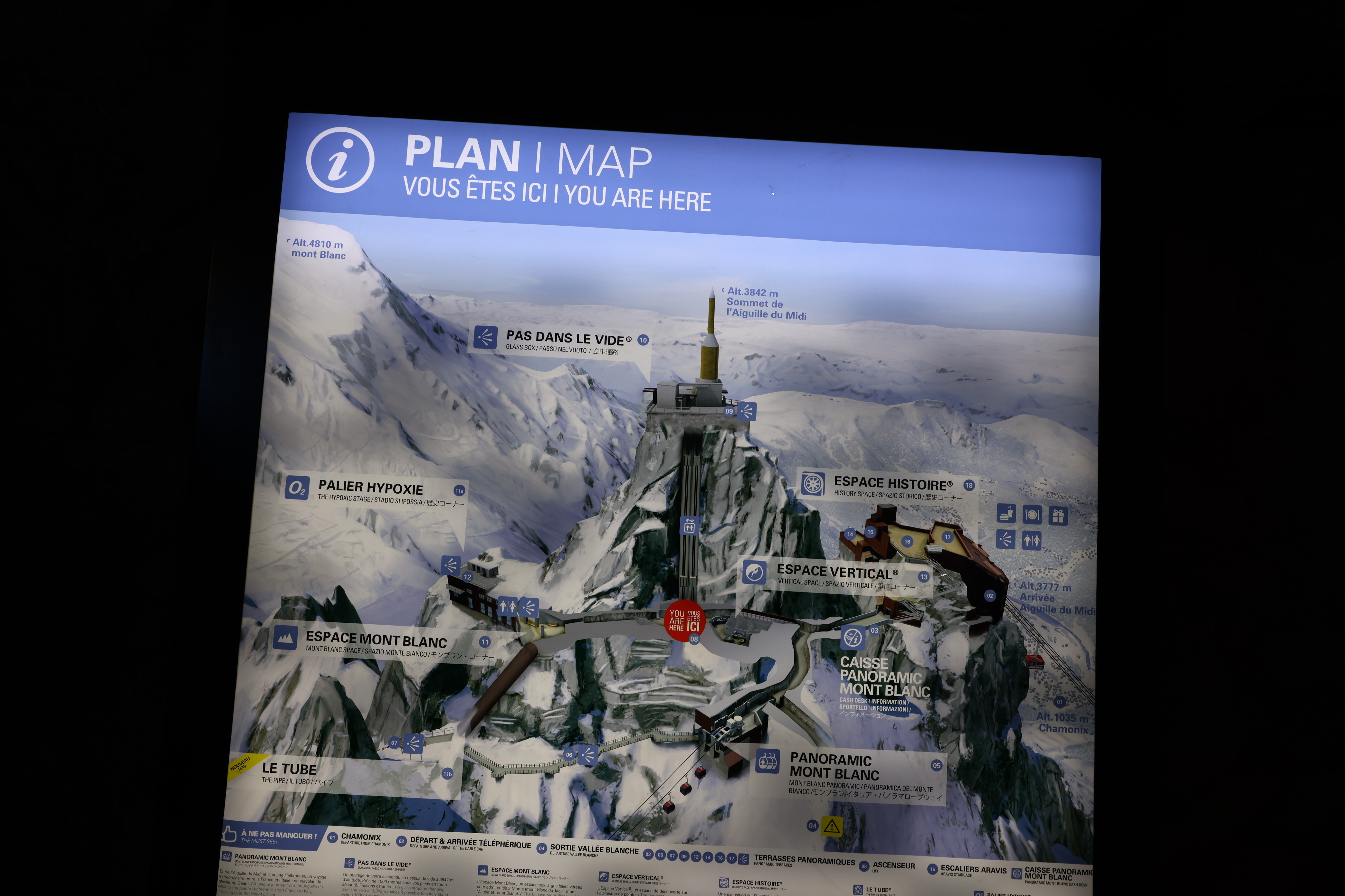 ▲南針峰纜車站的詳細圖示;大致可分為三層,纜車抵達的第一層,海拔其實是3788公尺,搭電梯到最上層的海拔才是3842公尺。(攝自纜車站說明圖)