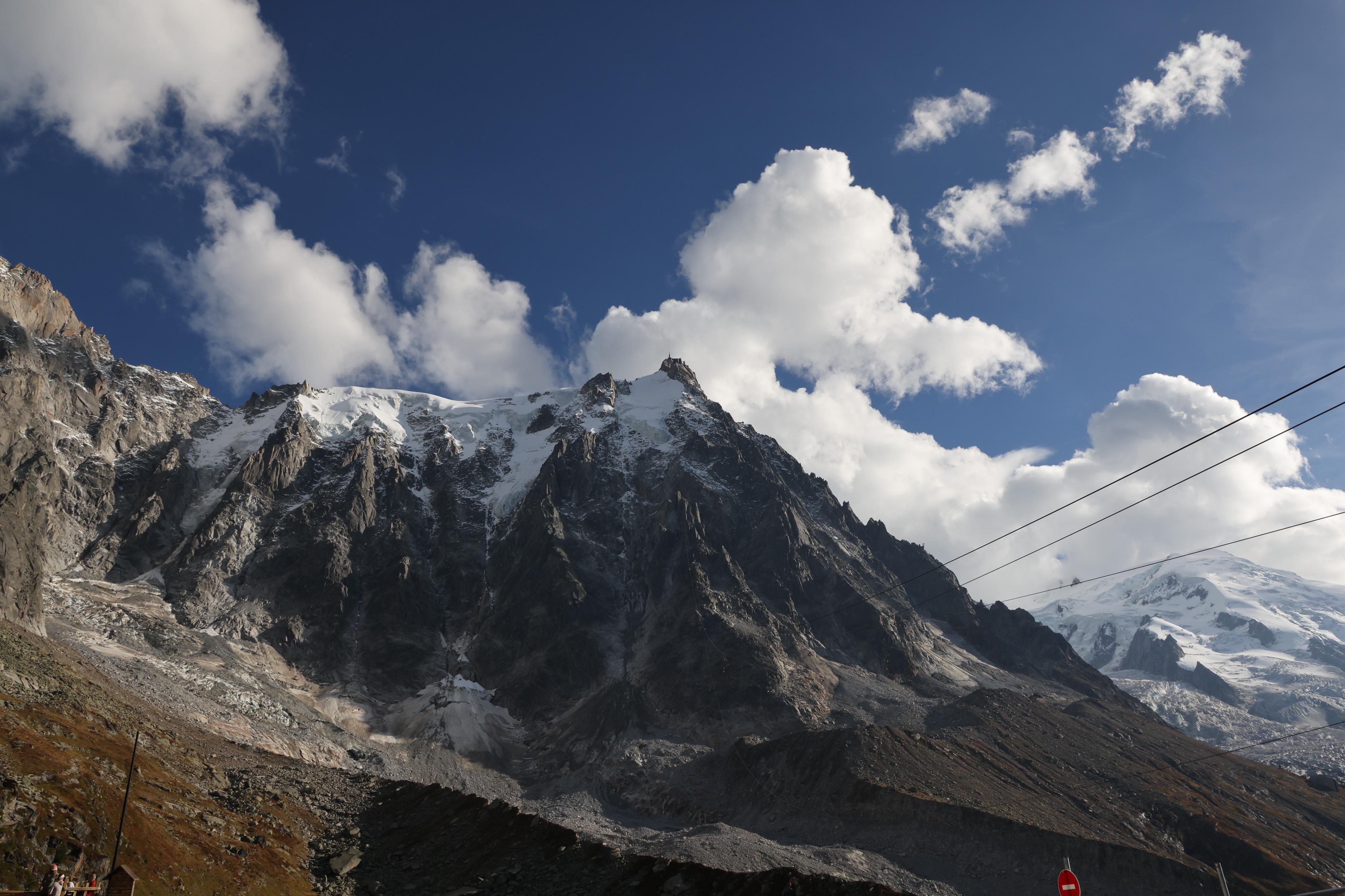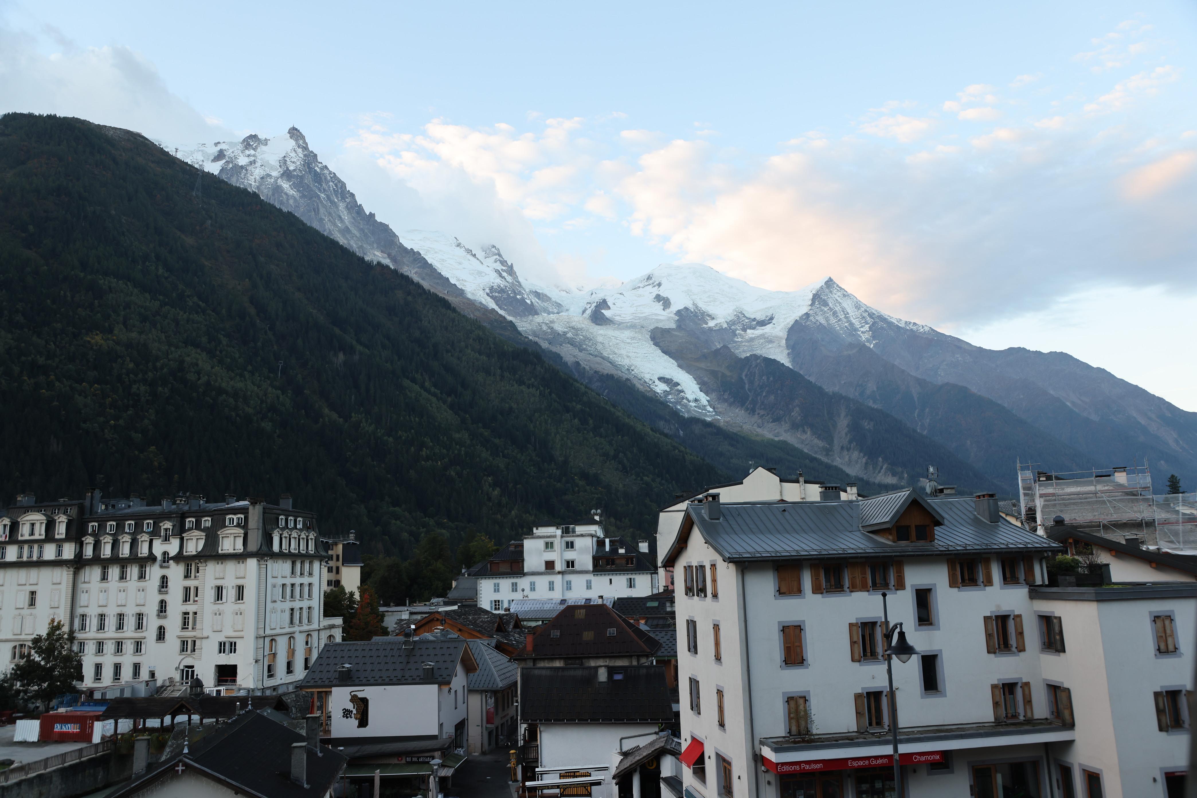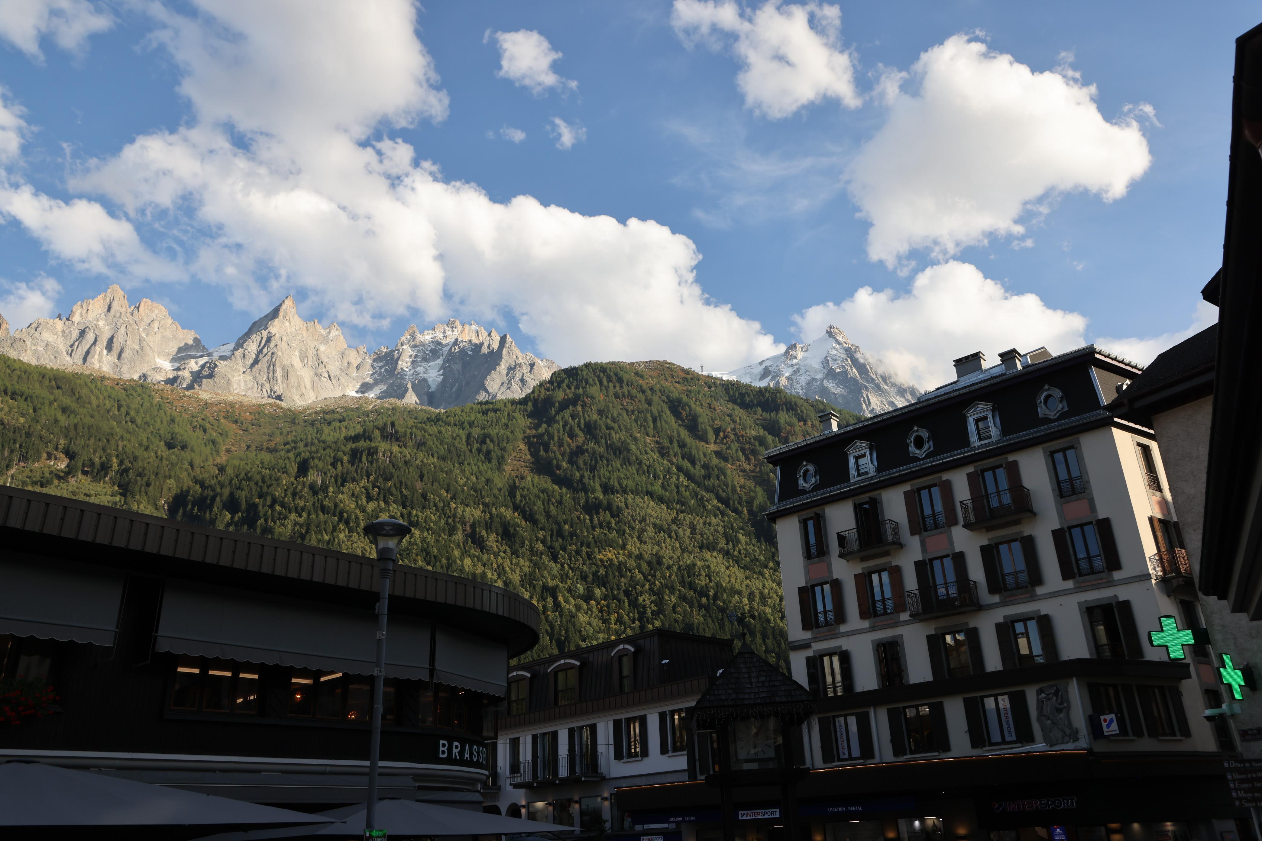 ▲▼從霞慕尼市區抬起頭來,或從建築物間的空隙,就可見南針峰(上)、柏松冰河(Glacier des Bossons)及白朗峰(下)。
