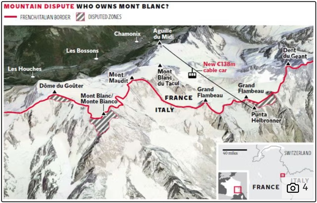 政治人物出席商業典禮,往往別有用意。義大利總理出席纜車啟用儀式,被外界解讀為向法國示警—希望加速解決長年懸而未決的邊界爭議。長久以來,法國與義大利在白朗峰一帶有三處領土糾紛,其中一處就在赫爾布羅納峰纜車站附近,總面積約三千公頃。白朗峰區域的國界多沿分水嶺劃分,但法國主張依1796年雙方條約,部分區域不應沿此界線。犬牙交錯的高山邊界,本就容易產生爭議,尤其牽涉重大觀光利益。義大利近年屢次呼籲協商,但顯然問題棘手,否則早已解決,我們就靜觀其變。