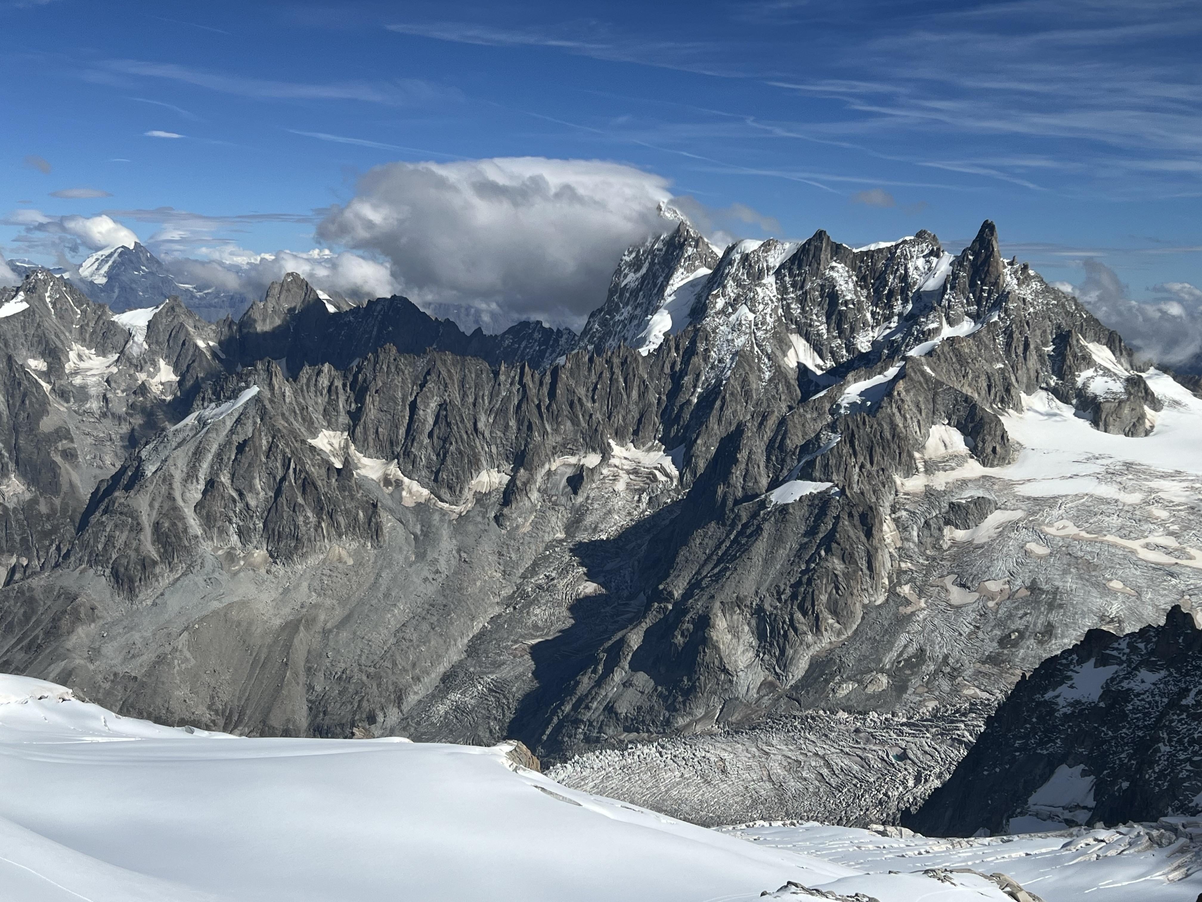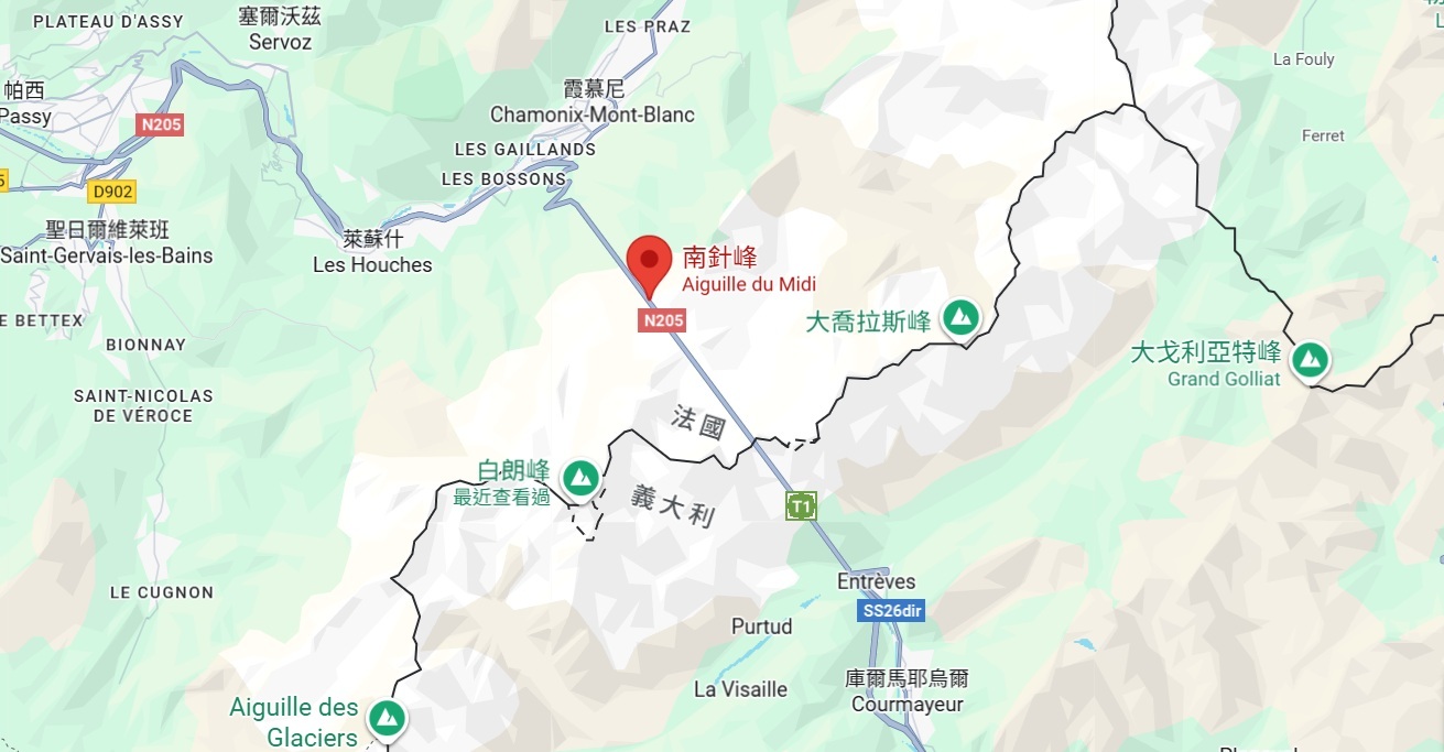 我曾前後兩次登南針峰。第一次是2023年10月,因緣巧合,兩年後的2025年9月再度前往,但路線不同。這次從義大利境內海拔1300公尺的庫馬約爾(Courmayeur)上山,登上南針峰後,再由法國境內海拔1037公尺的霞慕尼(Chamonix)下山;第一次則是上下都從霞慕尼。
