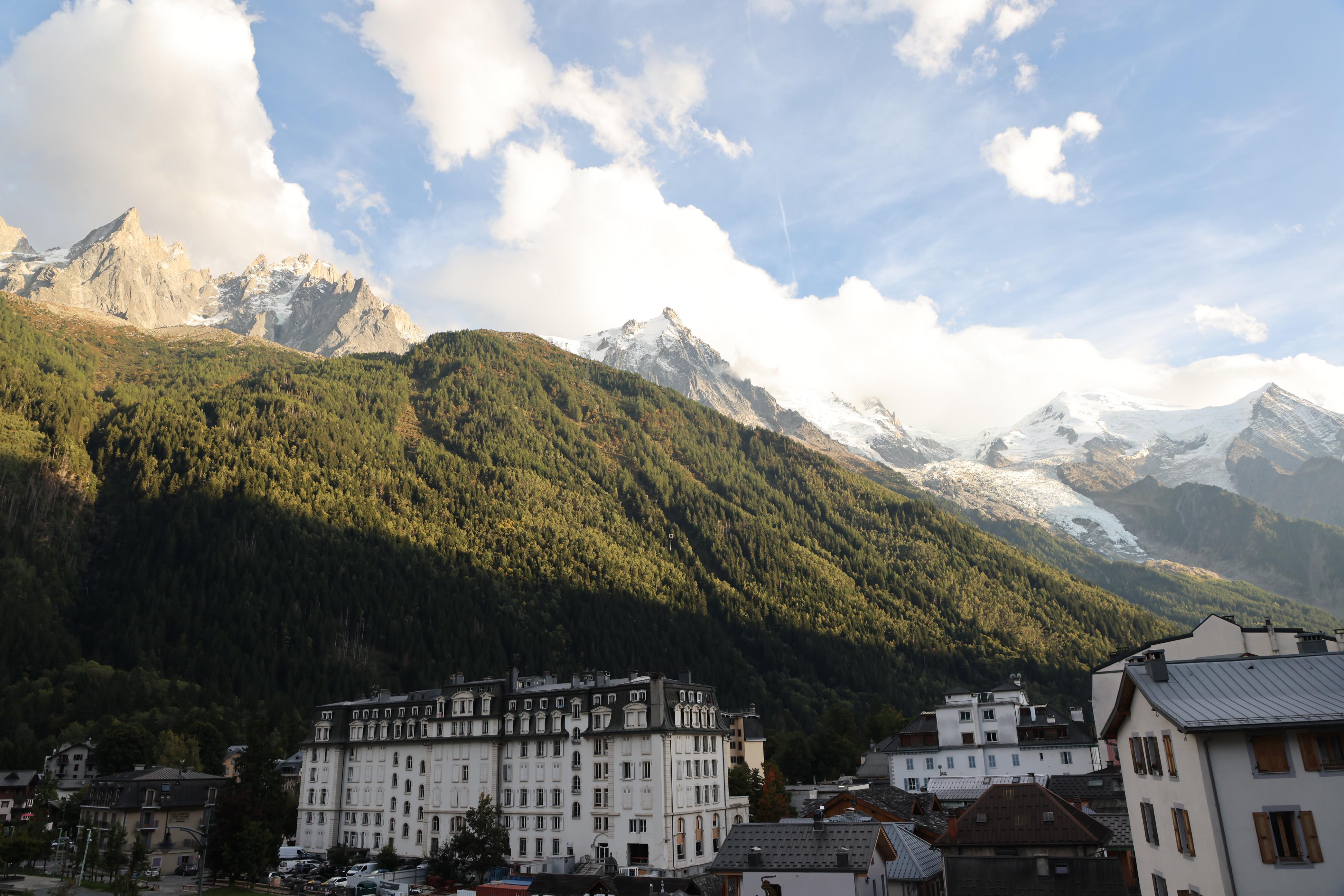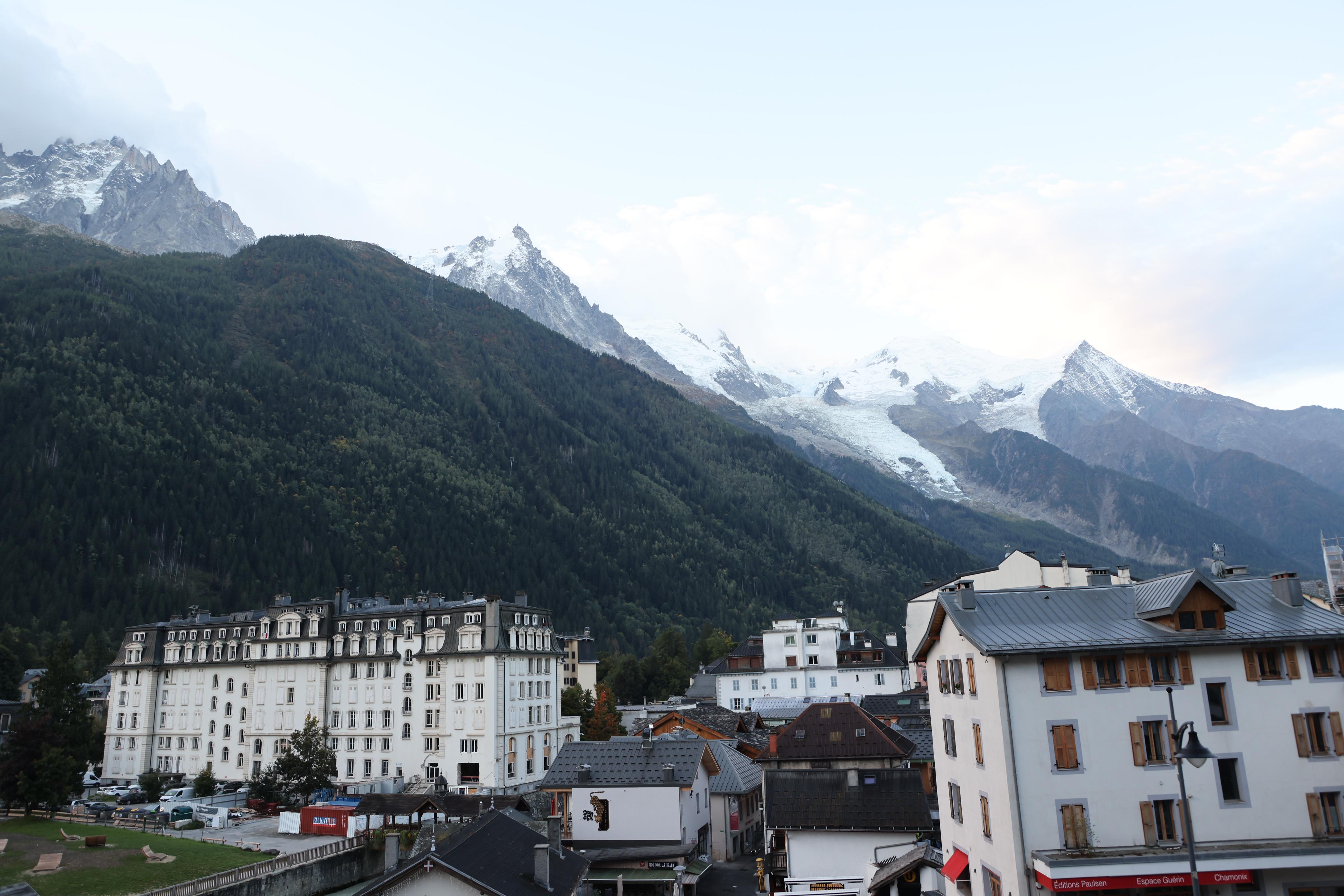▲▼清晨七點多(上),及下午六點多(下),從霞慕尼市區同一地點所見的南針峰、白朗峰及柏森冰河(Glacier des Bossons)。