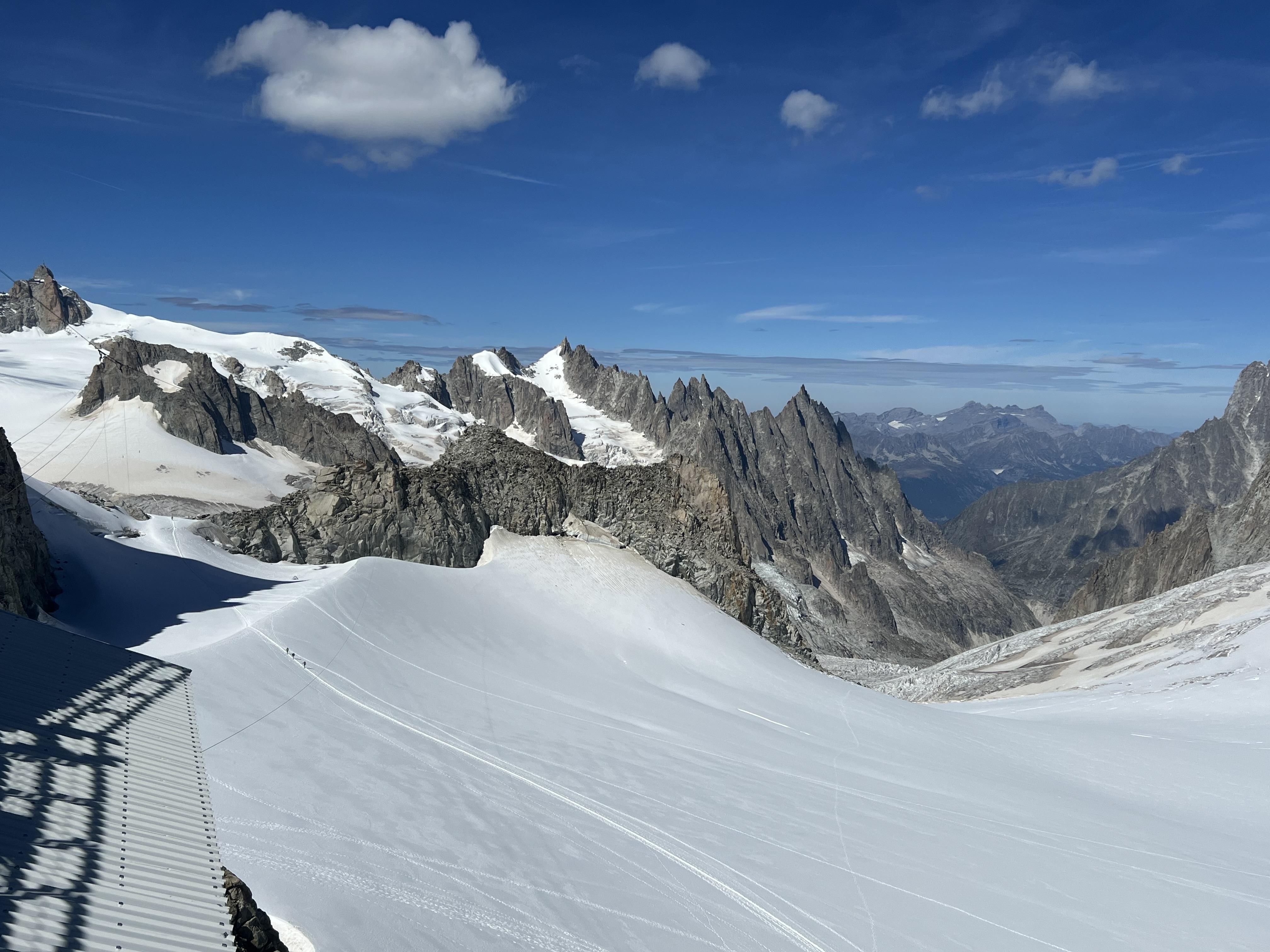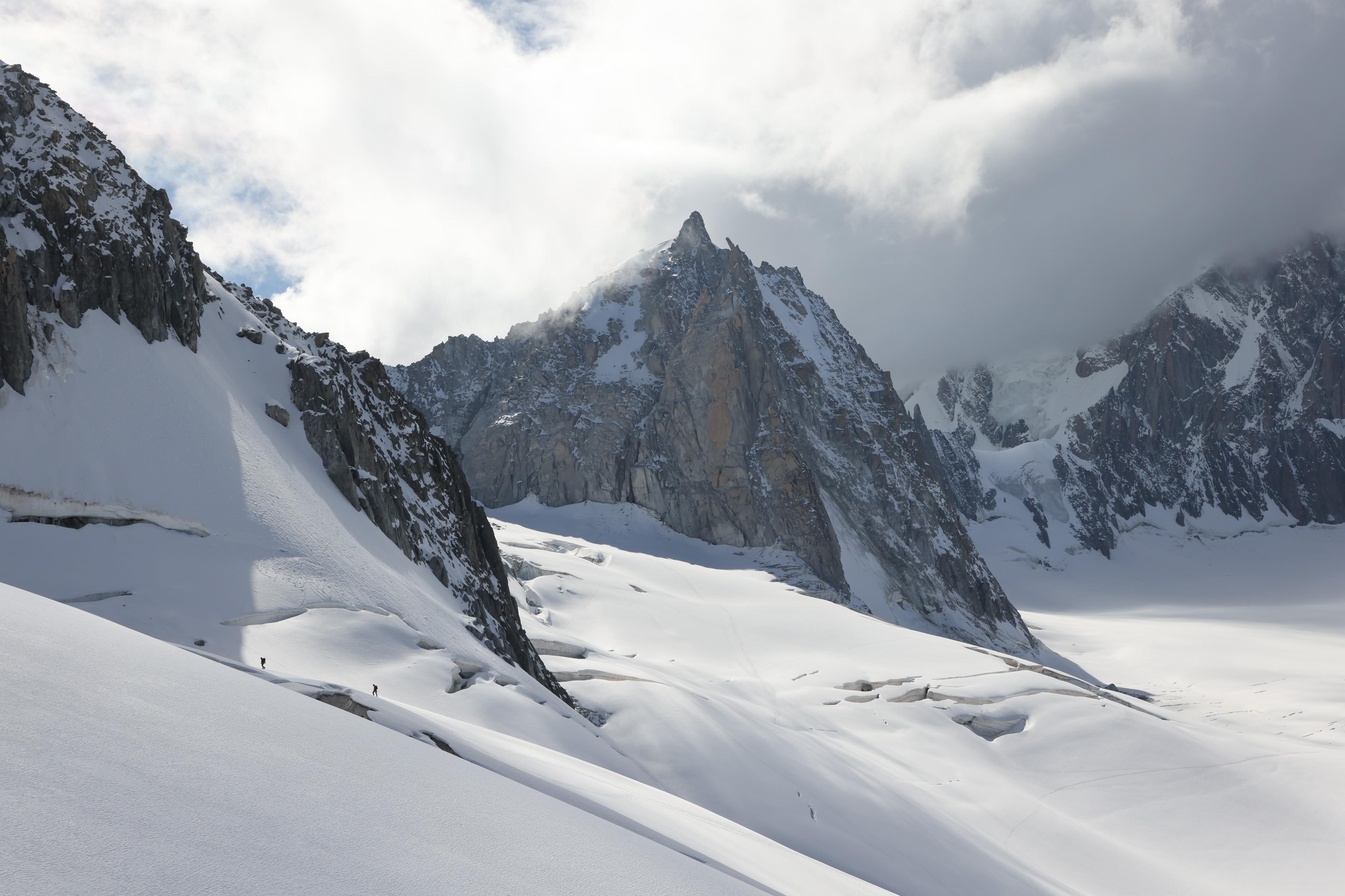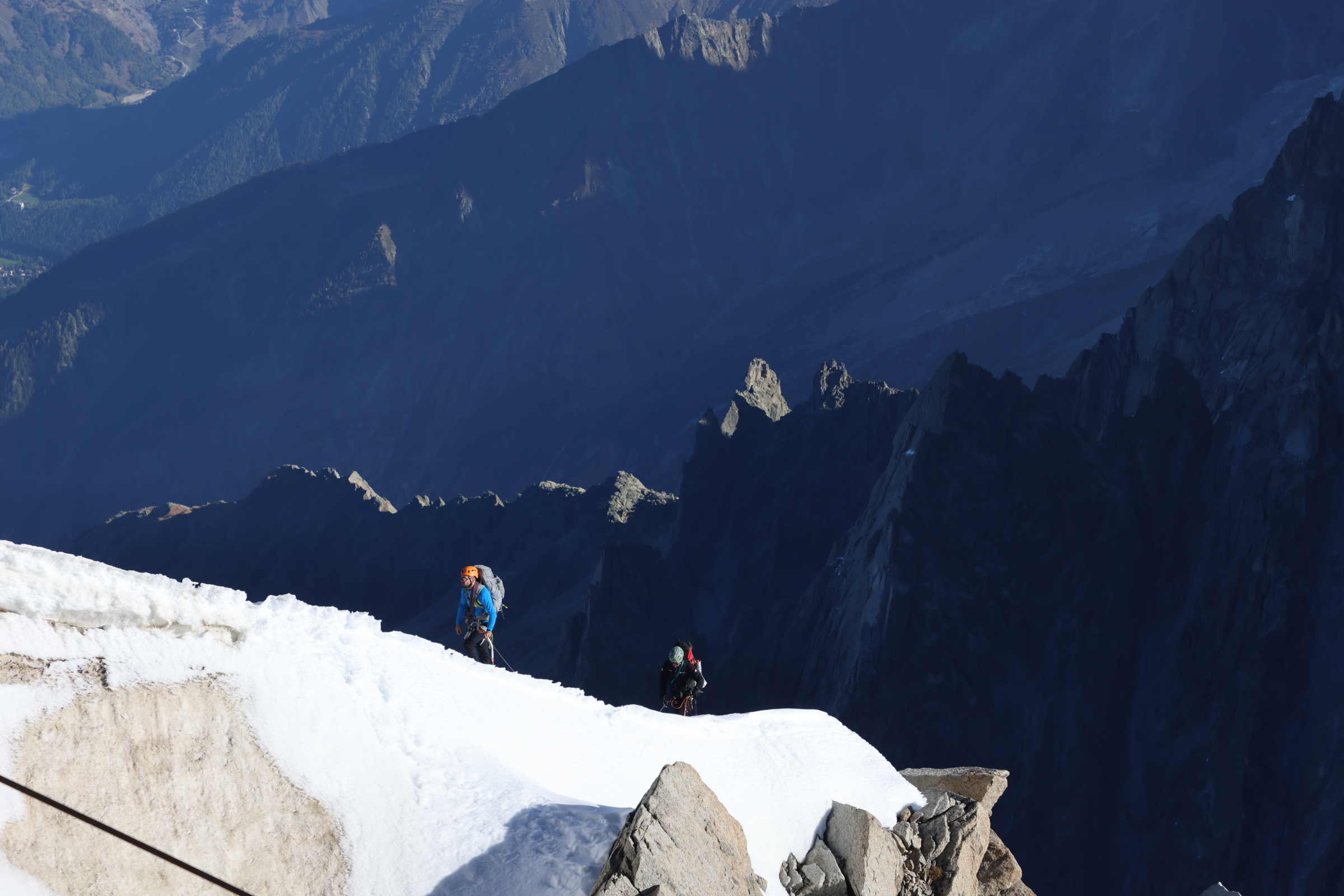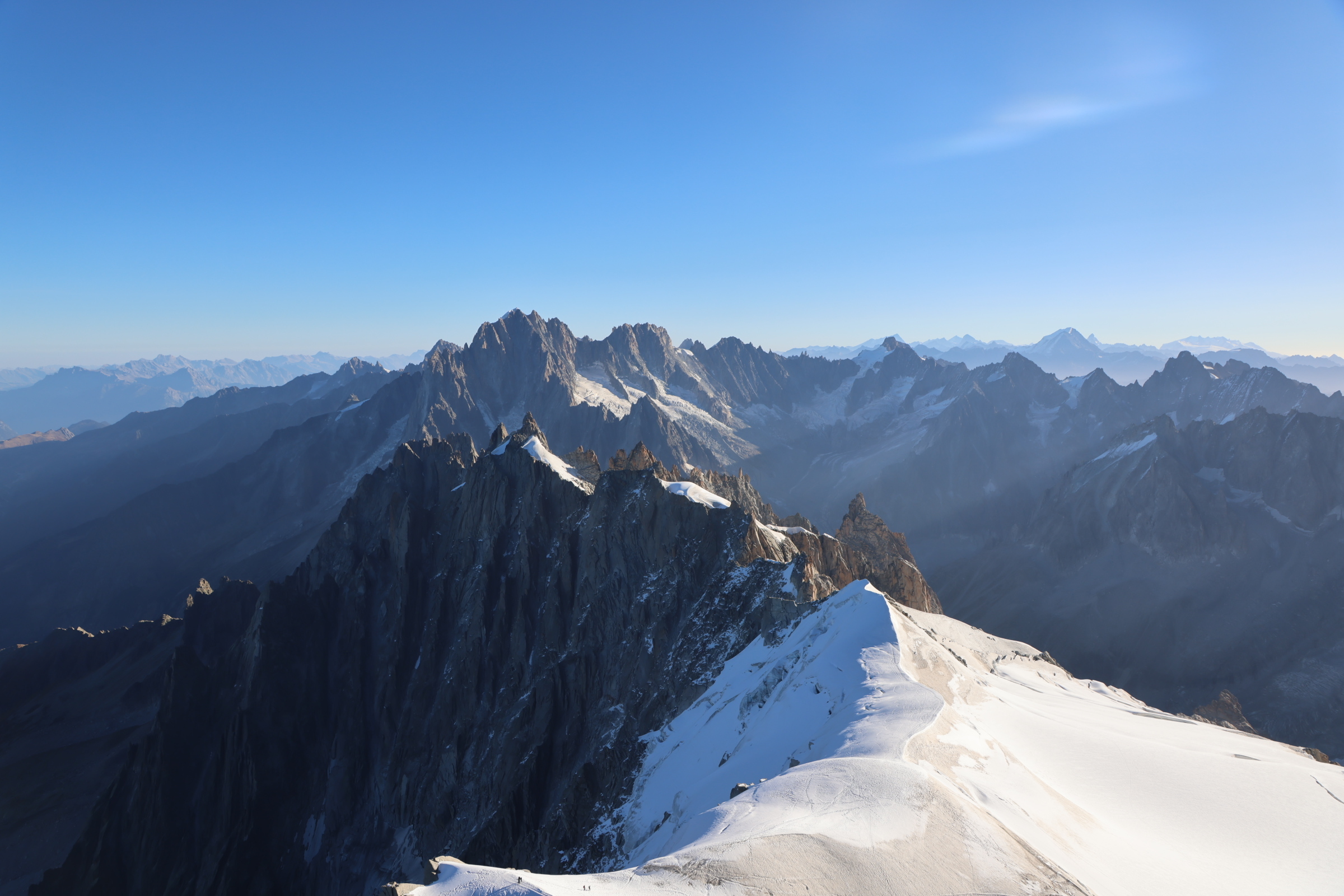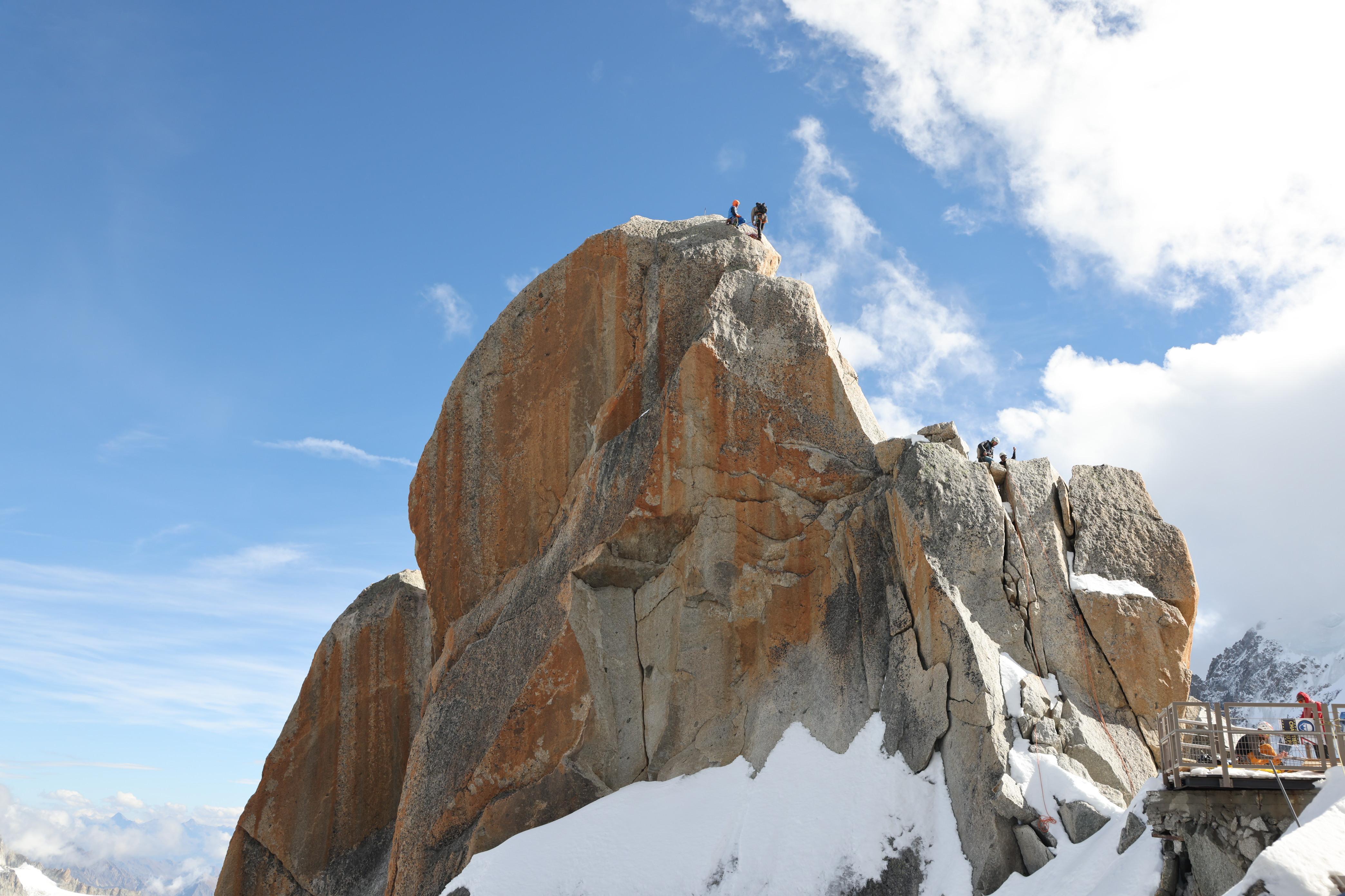 說纜車站外的世界杳無人跡,其實仔細看並非如此。剛纜車抵站前,就見兩名登山客在白雪皚皚的稜線上奮力攀登,另有三人正往下走,與纜車站連通的南柱峰(Pilier Sud),一柱擎天,光禿禿的石壁上,也可見數名攀岩者。更早之前,我們從義大利境內海拔3466公尺的赫爾布羅納峰(Pointe Helbronner),換搭第三段纜車登南針峰時,也看到底下雪原上,孤勇的登山客,身影渺小得幾乎無法辨識,正沿著雪原上的小徑,踽踽獨行,這應已超過我們想像的休閒娛樂。人總熱衷於征服巔峰,突破自我—無論是人生的、地理的,或心靈的。山,對「樂山」者而言,有著致命的吸引力。