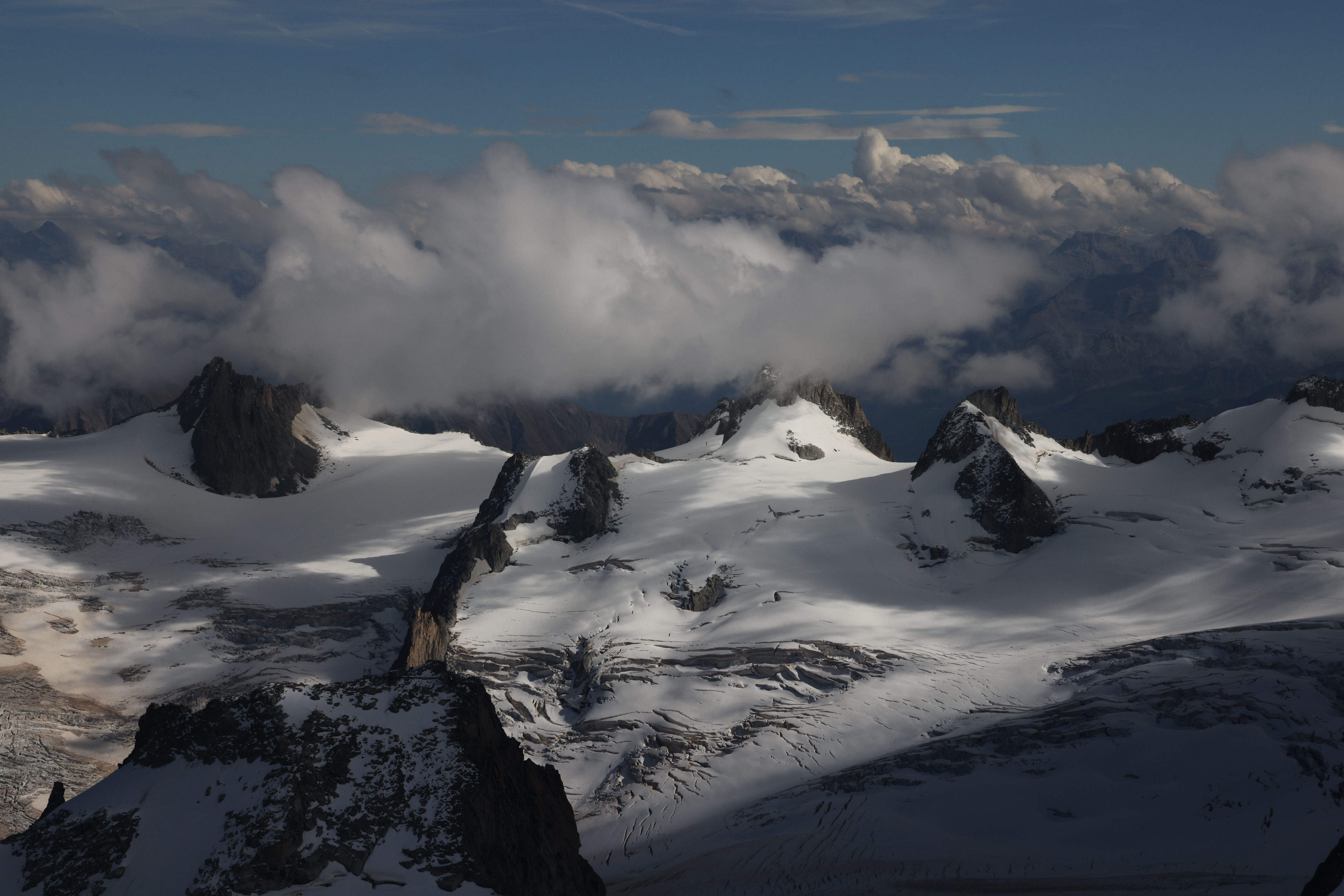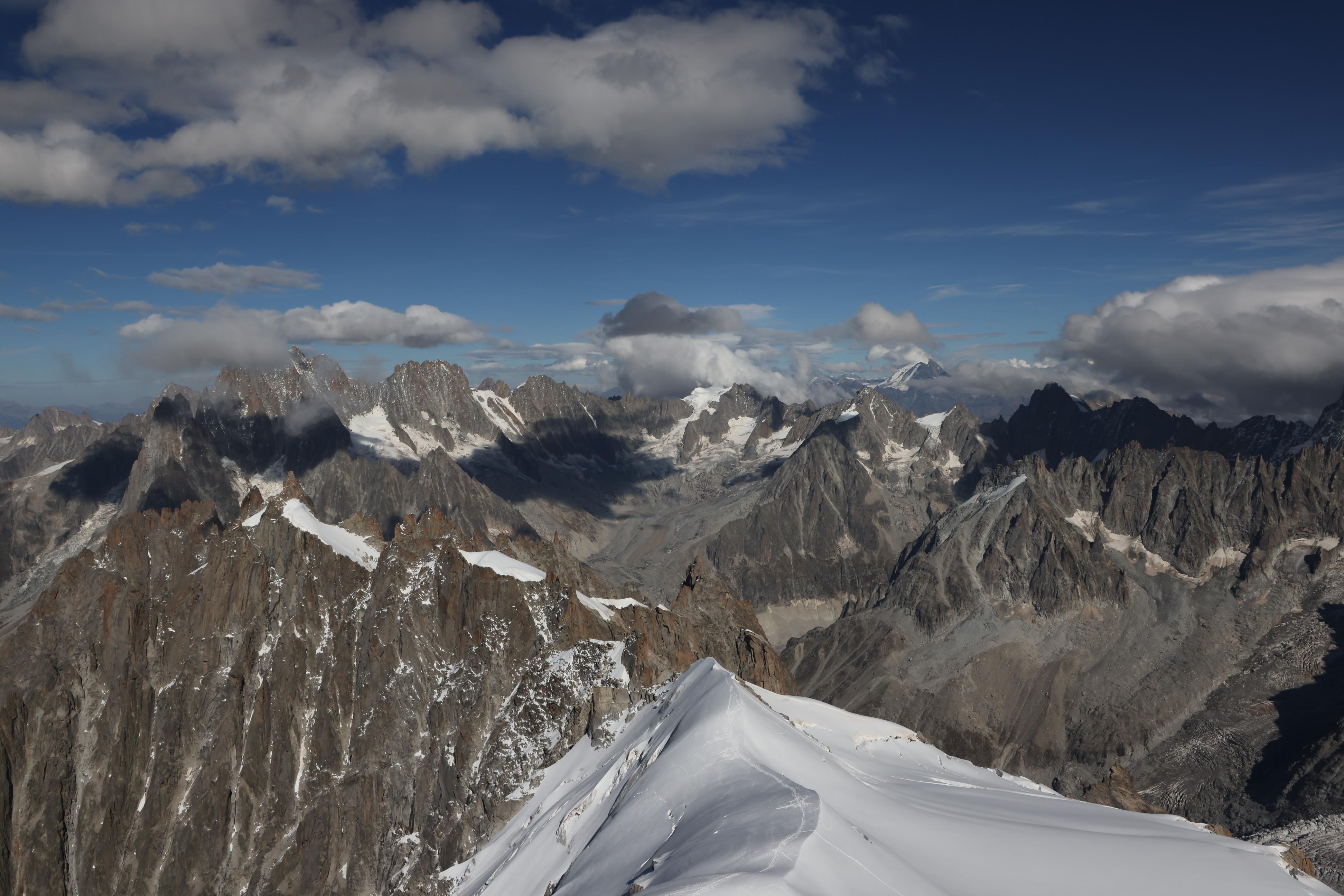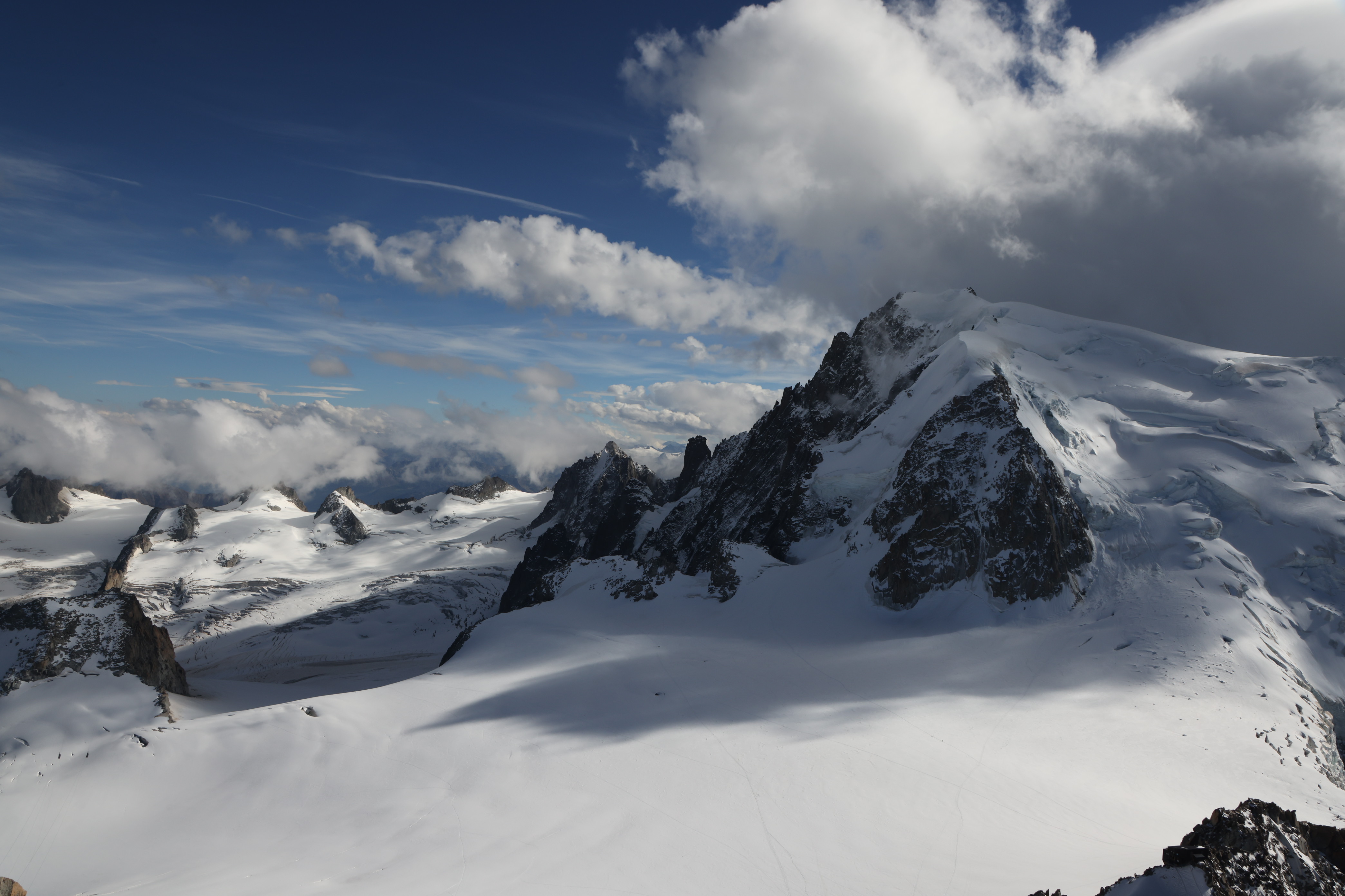 我們下午近三點才登上南針峰(Aiguille du Midi),稀薄的空氣讓人不覺深深吸了一口氣。極目四望,西歐之巔、阿爾卑斯山最高峰—海拔四八一〇公尺的白朗峰(Mont Blanc),就在不遠處。因終年積雪,一片銀白,法文Mont Blanc為白色山峰之意,可惜今日雲氣蒸騰,霞光氤氳,山頂罩著一層厚厚白雲,白朗峰芳蹤杳然,無法見廬山真面目,不無遺憾。