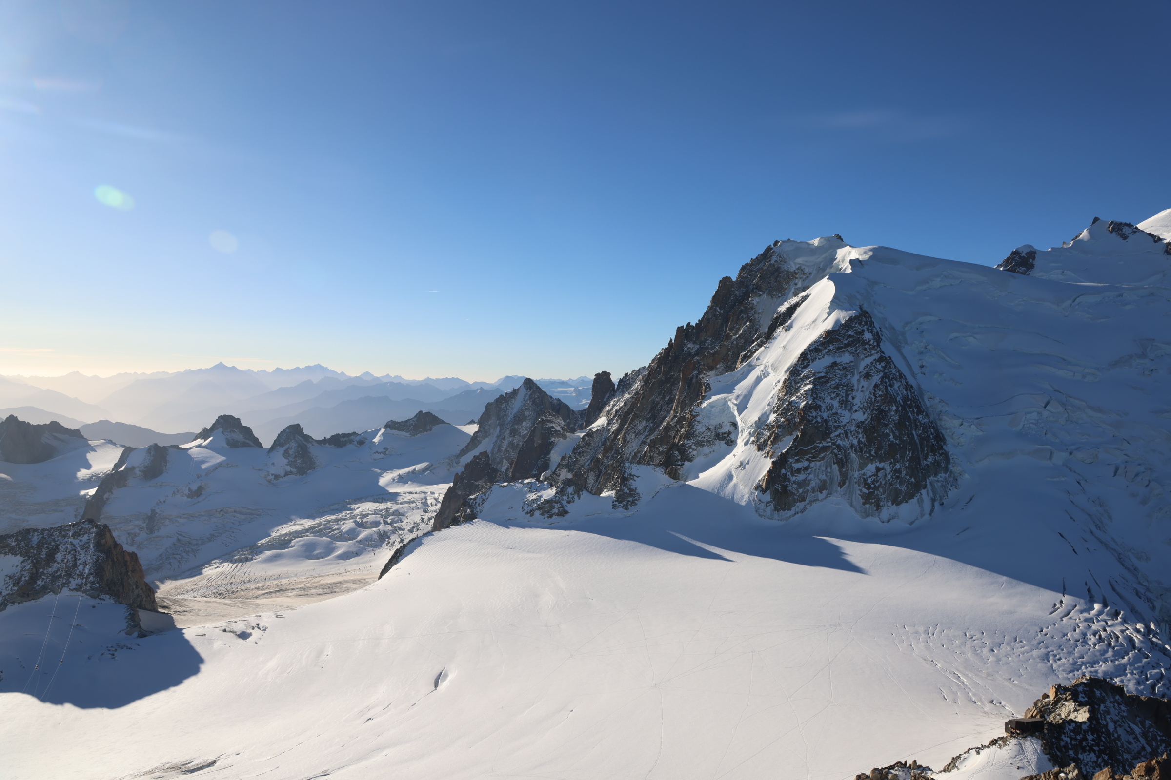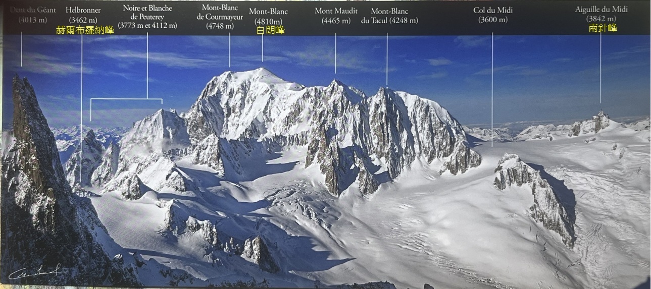常聽人說「登白朗峰」,其實有些誇大,準確地說,只能從南針峰遠眺白朗峰,這也是觀賞白朗峰最好的地點。與其他兩座瑞士名峰相同,少女峰(Jungfrau)要從少女峰鞍部(Jungfraujoch)遠望,馬特洪峰(Matterhorn)則從高納葛拉特(Gornergrat)欣賞。若真能親身攀上白朗峰頂,恐怕反而只覺得「只在此山中,雲深不知處」。另外國內旅行社有所謂「盡攬瑞士三大名峰」的行程,其實也並不精準,白朗峰位於法、義兩國邊境,並不屬於瑞士,登南針峰,只能由法國的霞慕尼(Chamonix),或由義大利的庫馬約爾(Courmayeur),兩者皆不在瑞士境內,但距離邊界確實不遠。