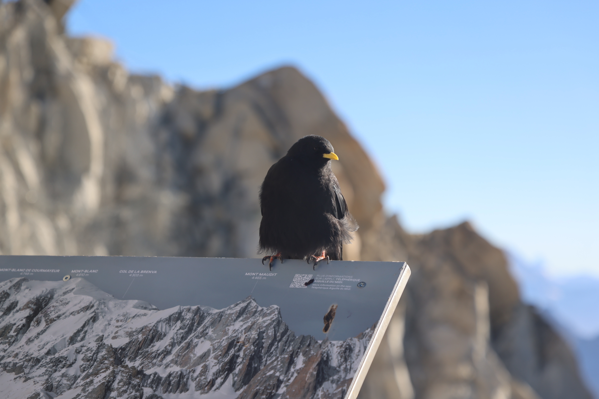 我曾前後兩次由南針峰,近距離眺望白朗峰,第一次是2023年10月,因緣巧合,兩年後的2025年9月再度前往。兩年前來時,我們早上九點便登上南針峰,萬里無雲,白朗峰似近在咫尺,其實兩地還相距約八公里。四周的緩坡,一片白雪皚皚,潔白無瑕,陡峭嶙峋的山壁,則露出灰黑山體。雲海在腳下翻湧,群峰如靜默的浪濤,向無盡天際展開。陽光強烈,風聲冷冽,似也帶走塵世的喧囂。遠眺蒼穹,藍得似要滴水。儘管纜車站內人聲鼎沸、萬頭鑽動,但站外的群山卻是無邊無際的靜謐,仿佛走入永恆,無限孤獨,無限寂寞,也仿佛天地在此交會,相互融合,而時間在此凝結,失去刻度;只見高山特有的黃嘴山鳥,時而飛翔,忽高忽低,時而停佇,蹦蹦跳跳,活力十足。