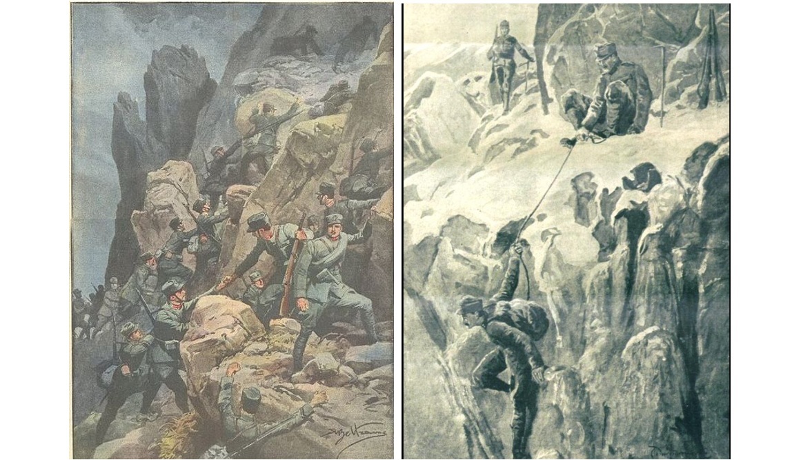 ▲一戰時義大利前線多洛米堤之戰的一些場景,左為義大利方,右為奧匈帝國方的軍隊。(摘自Wikipedia)
