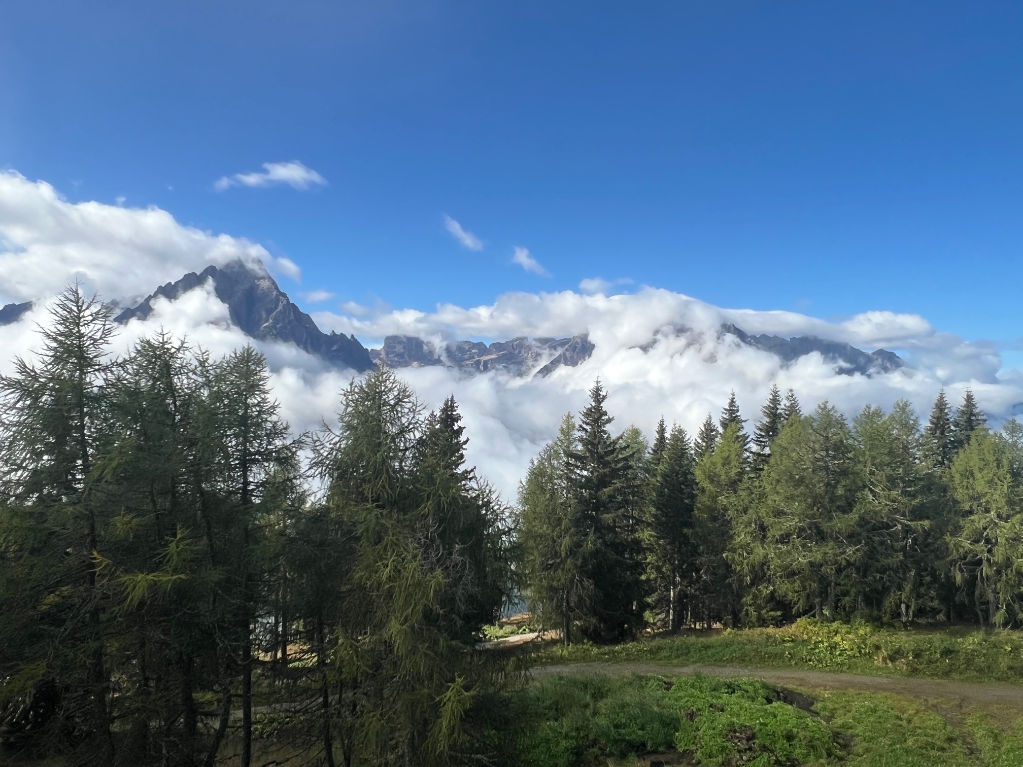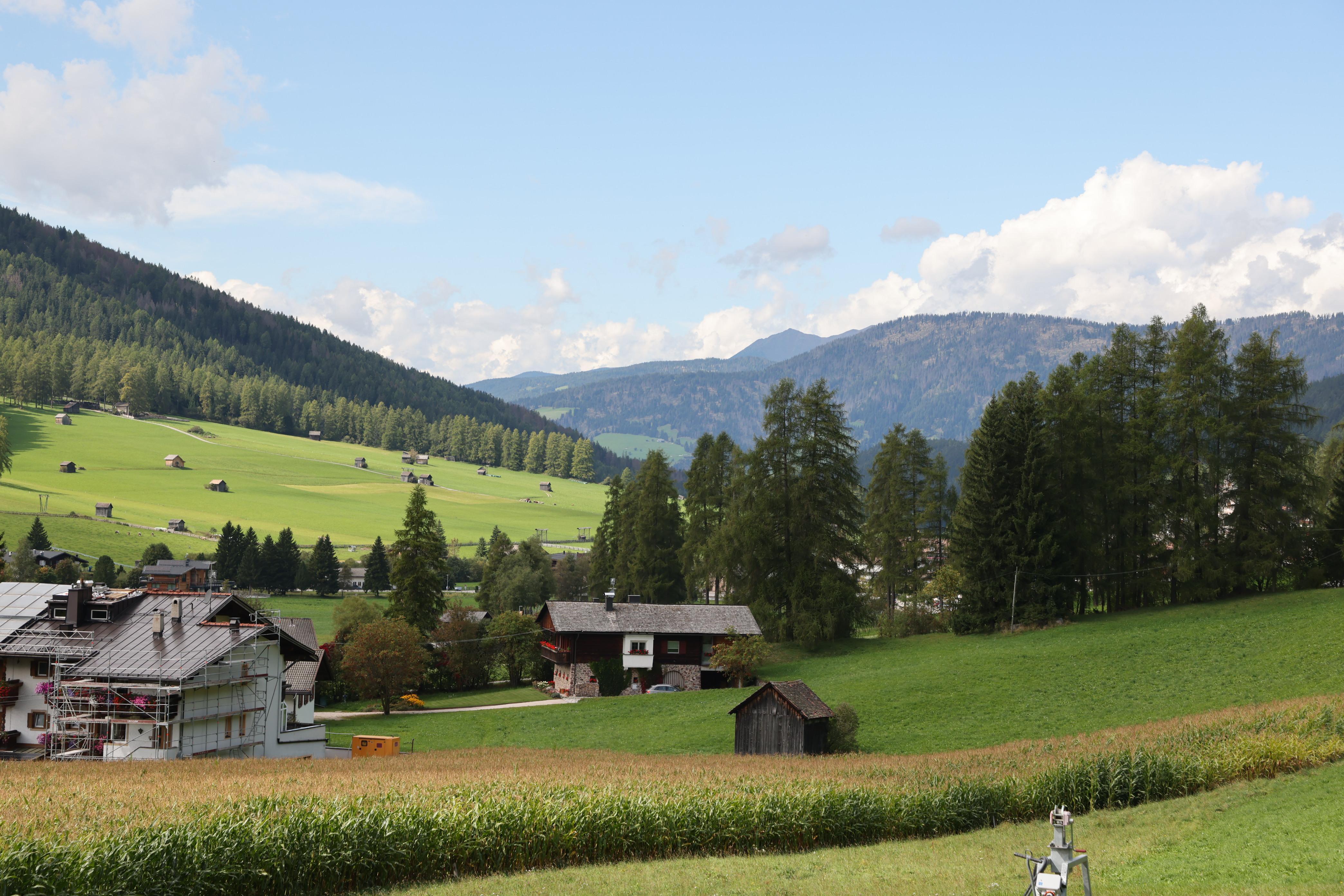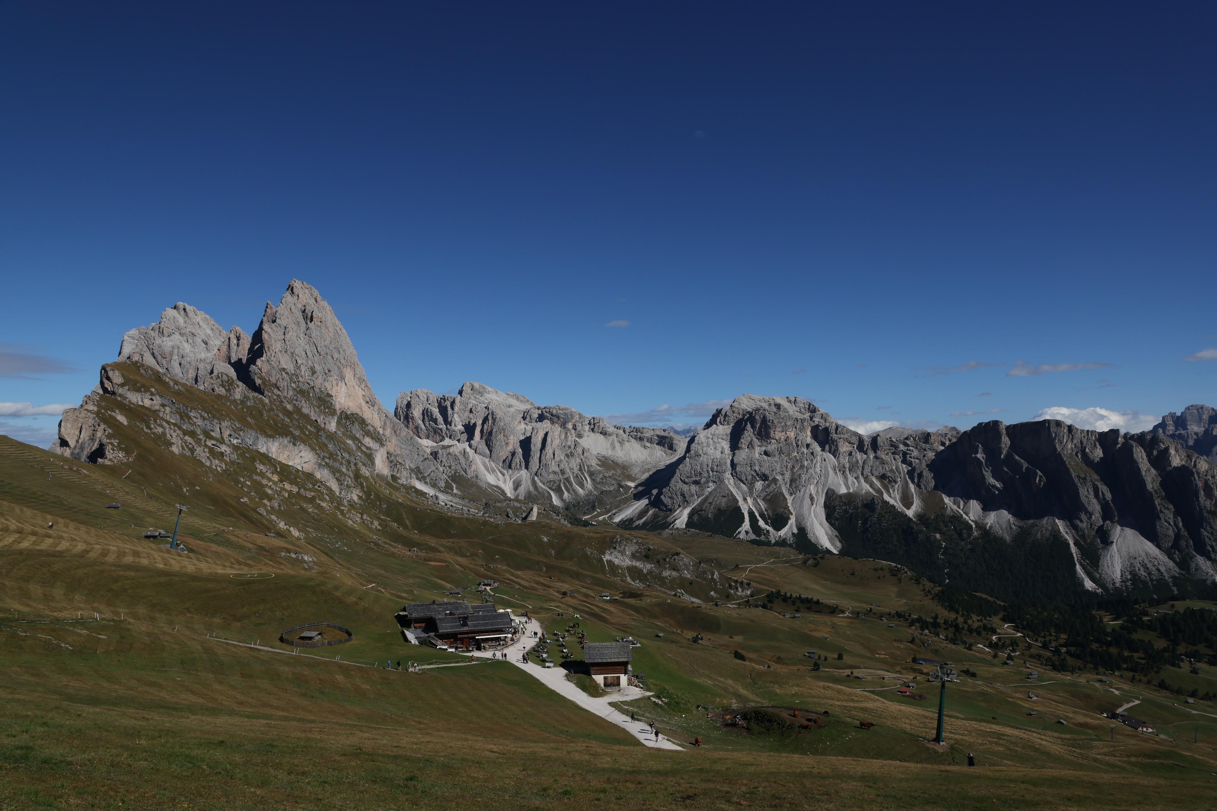 遠方的山巒如凝固的浪花,層層疊疊,在湛藍天空襯托下,銀光閃閃,有些山尖還有雲霧飄渺,神秘而悠遠。山勢陡峭但氣勢雄渾,如刀削斧劈,令人屏息,彷彿是大地裸露的骨架。山坡上,綠絨般的草坡緩緩起伏,以柔軟之姿,調和了山勢的剛強,不知名野花散佈其間,隨風搖曳。草坡間,木屋錯落點綴,雲霧輕繞,山路蜿蜒,像飄逸的絲帶,小巧教堂的尖塔指向天空,鐘聲蕩漾在谷地之間,將信仰鑲進婉約的風景裡。陽光灑落,牧場與樹林層層交織,空氣裡都瀰漫著青草的氣息。這片靜謐的大地,人與自然,在此達成最古老的融合,時光在此放慢了腳步,只有光影在山巒間流轉,恬靜如一首未完成的田園詩,多洛米堤山色令人流連。
