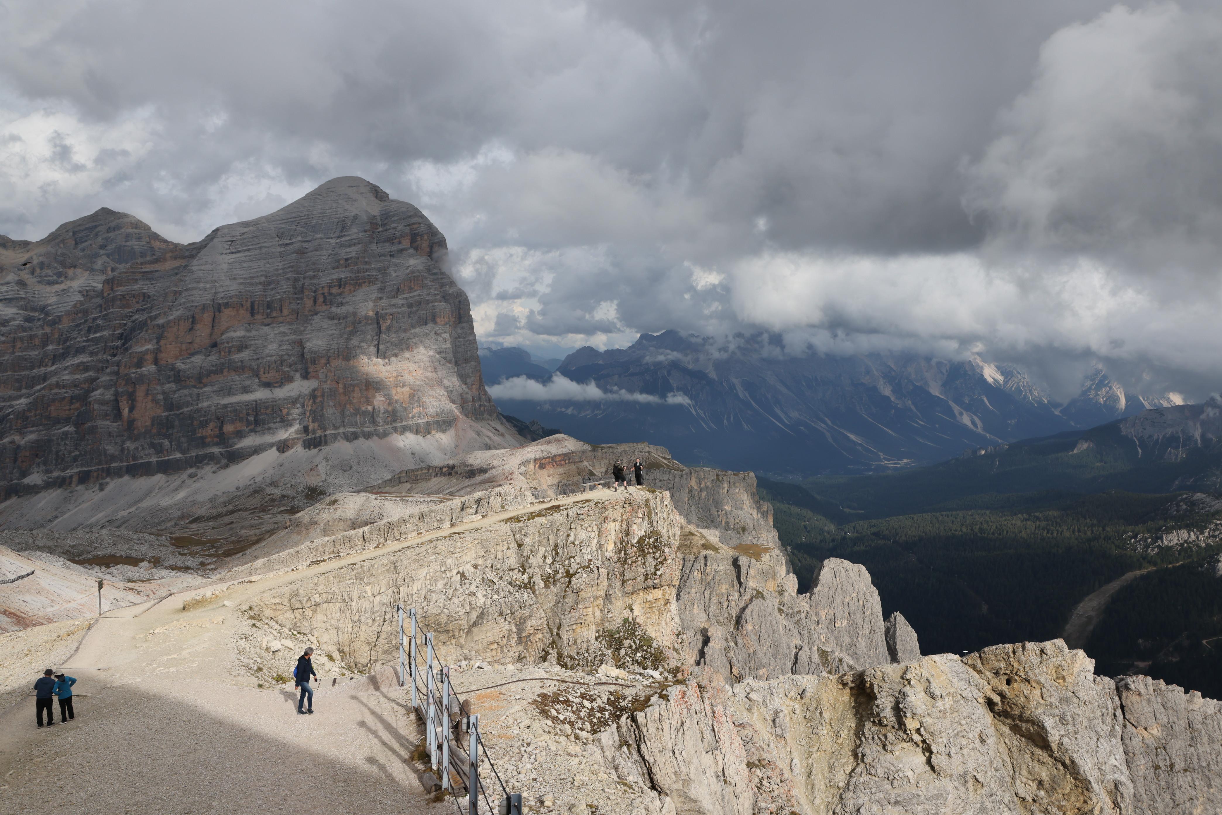 在海拔2752公尺的拉加佐伊山(Lagazuoi)的山頂纜車站附近,山勢陡峭,山岩嶙峋,小徑旁的路標寫著:「奧地利高山師路徑(Austrian Mountain Troop Path)」及「往地道(To the Tunnel)」等字樣。多洛米堤的陡峭嶙峋的山峰,20世紀初是奧匈帝國跟義大利的國界,一戰時是所謂義大利前線的一部分,雙方的山地師在此挖地道、壕溝,到處埋設炸藥,搶佔制高點,發生激烈的戰鬥,廝殺得天崩地裂,鬼哭神號;我們現在所在的拉加佐伊山,及山下的法薩雷果隘口(Passo di Falzarego ),就是當時曾發生激烈戰鬥攻防的地方,數度易手。這場戰役雙方總共投入兵力最高達15萬人,死傷甚大,戰事從1915年持續到1918年,戰鬥都在2000公尺以上的高山進行,最高的戰場是海拔3950公尺的奧特萊斯峰(Ortles);這些高山冬季更都是被白雪覆蓋,更有些終年積雪,在銀色世界中開戰,因此也被稱為「白色戰爭(White War)」。子彈不長眼睛,戰場同樣不擇地域,美得像世外桃源的地方,居然也曾發生這麼血腥的戰爭,令人唏噓。