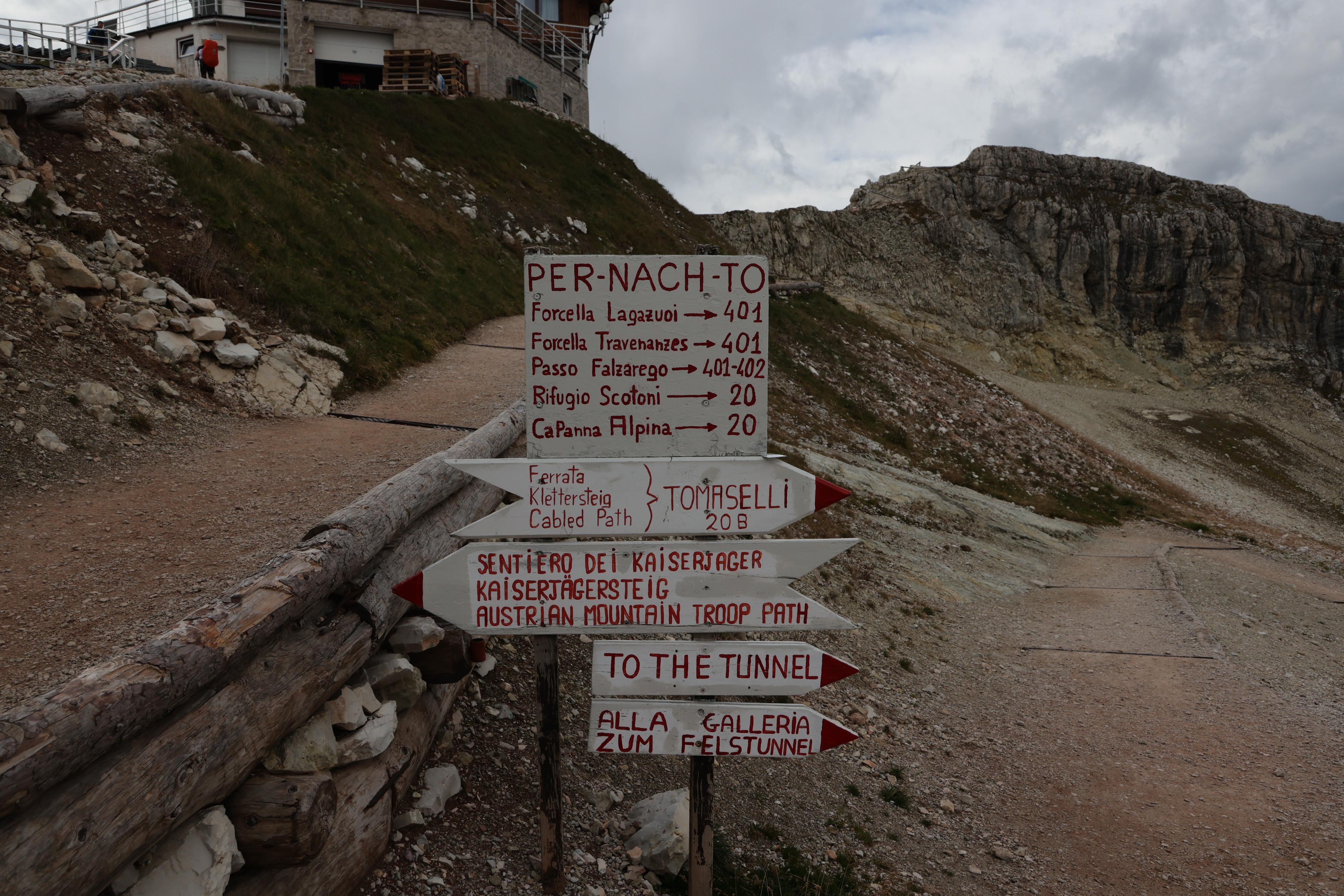 ▲▼▼拉加佐伊山(Mt. Legazoui)的山頂纜車站,海拔2752公尺,可看到不少一戰時,義大利與奧匈帝國高山師,在高海拔,山勢陡峭,山岩嶙峋,冬天滿是積雪的地方激戰的戰場遺蹟,像地道、連絡道等。路標上的Per-Nach-To,分別是義大利文、德文、英文的「往」,底下的指標同樣以三種文字呈現(上),及當年的部分戰場(下,下下)。