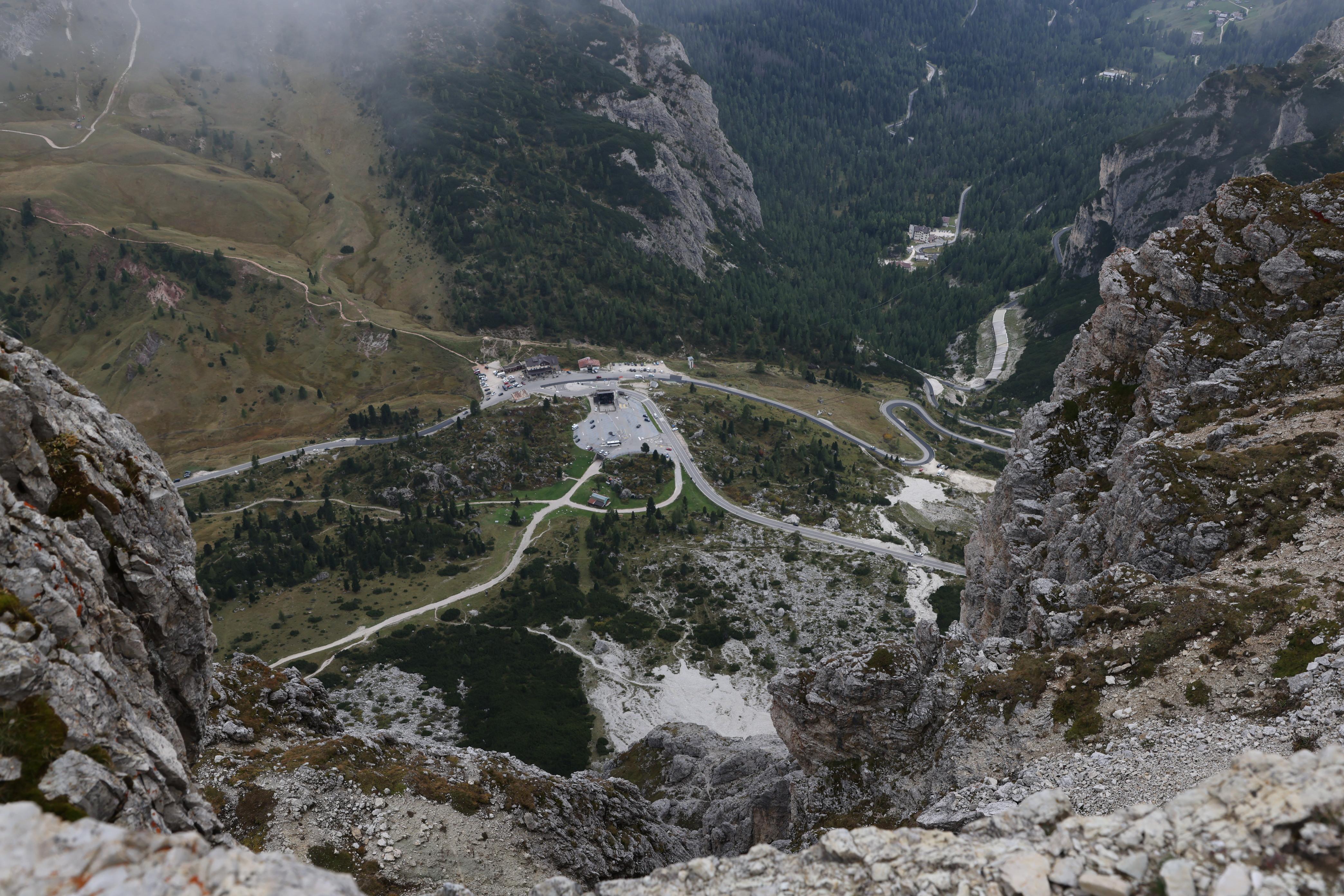 ▲從拉加佐伊山頂,俯瞰山下的法薩雷果隘口(Passo di Falzarego),法薩雷果隘口也是當年的戰場,雙方攻防激烈,數度易手。