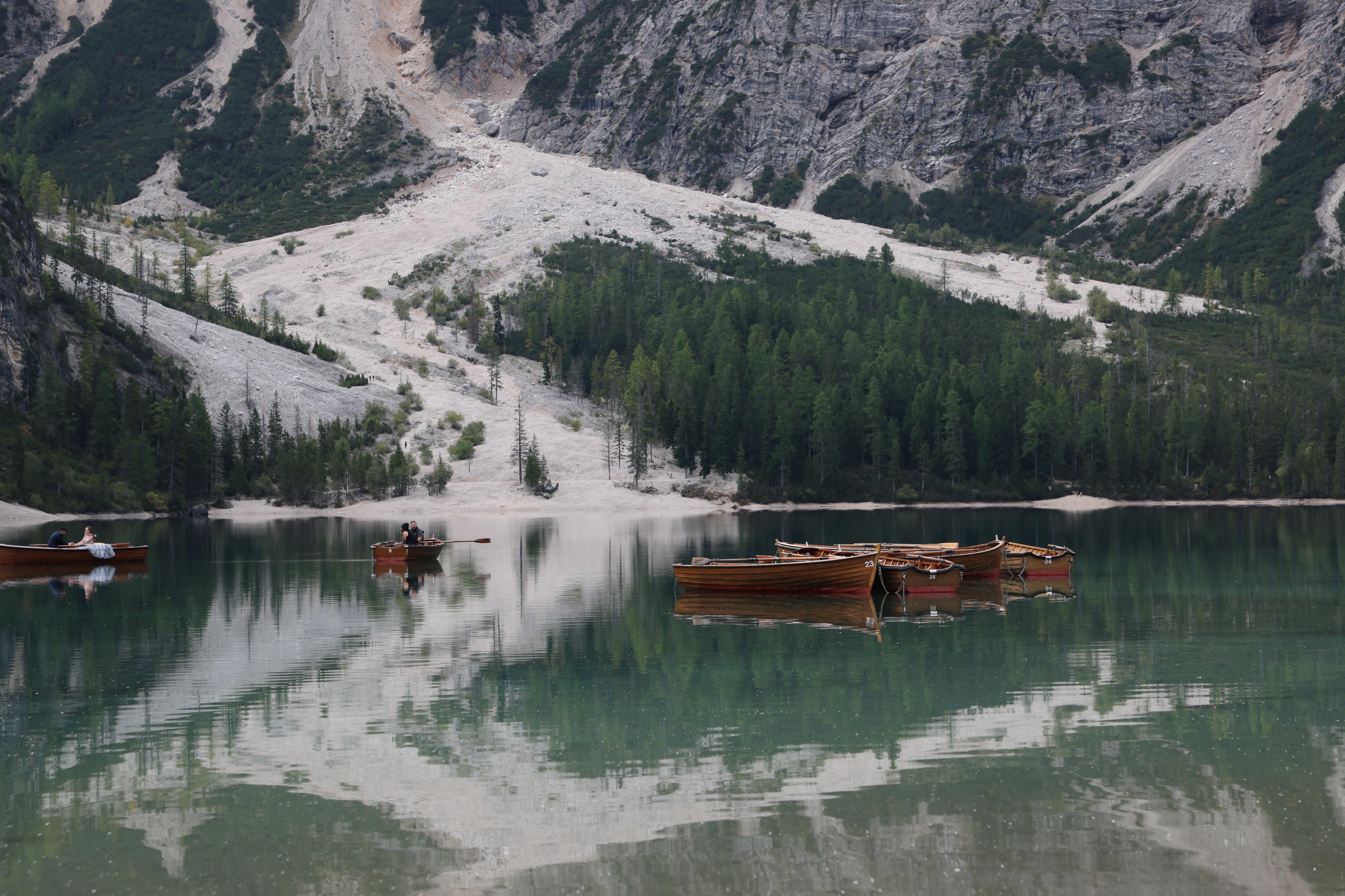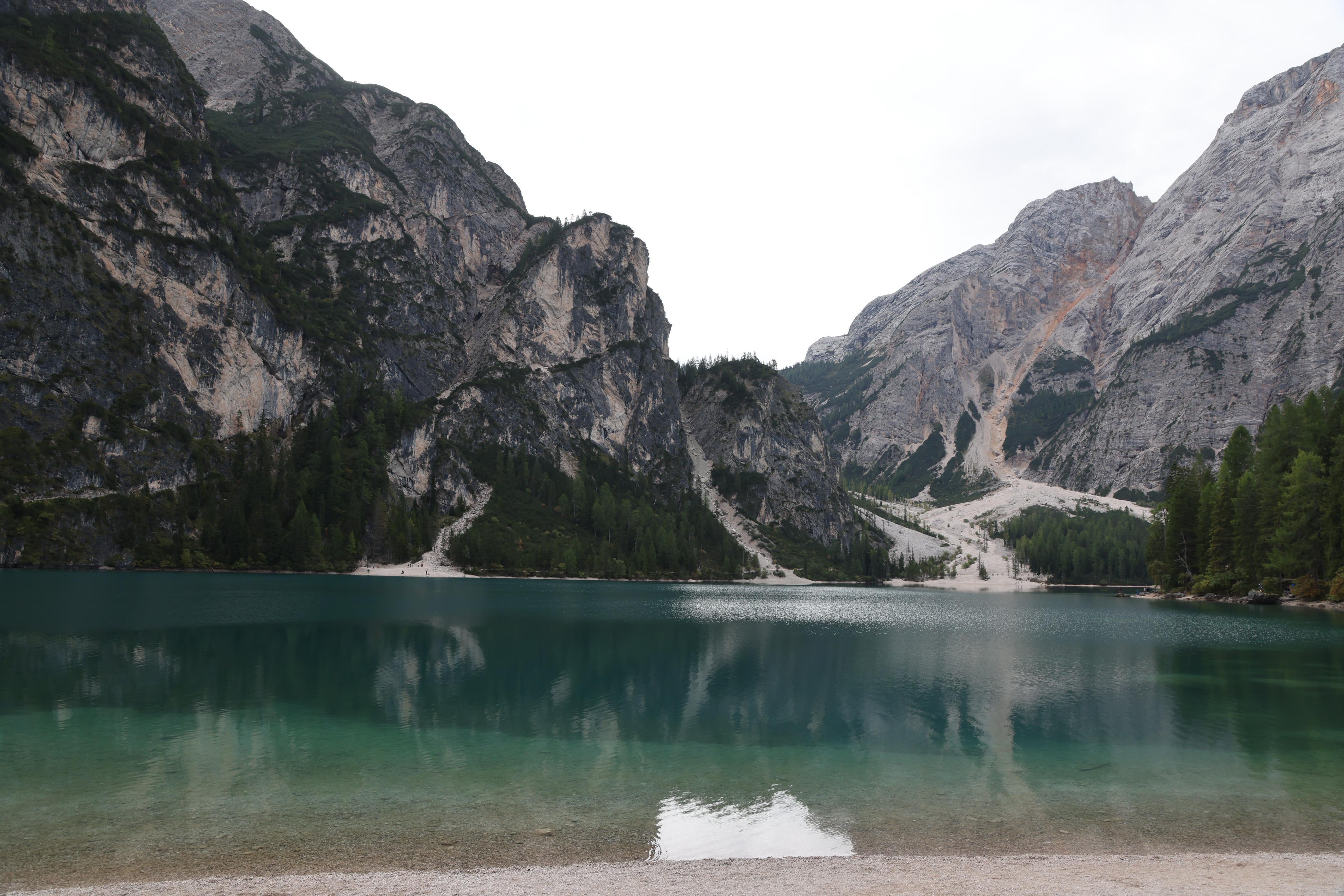 黛綠的湖水,像上帝遺落人間的寶玉,靜靜躺在山巒的懷抱裡。銀灰的山巒橫亙天際,水面如鏡,倒映著陡峭嶙峋的山脊,現實與虛影在澄澈中交融,分不清哪個才是真實?微風輕起,仿若天地之間的呼吸,波光揉碎了山影,蕩漾著一片片銀綠相間的幻影。枯木靜臥水中,蒼勁的線條勾勒出時間的質地。這一刻,天地彷彿停止了喧囂,唯有光影在湖面游移,多洛米堤的湖光,如詩,如幻,如一首亙古的讚歌。