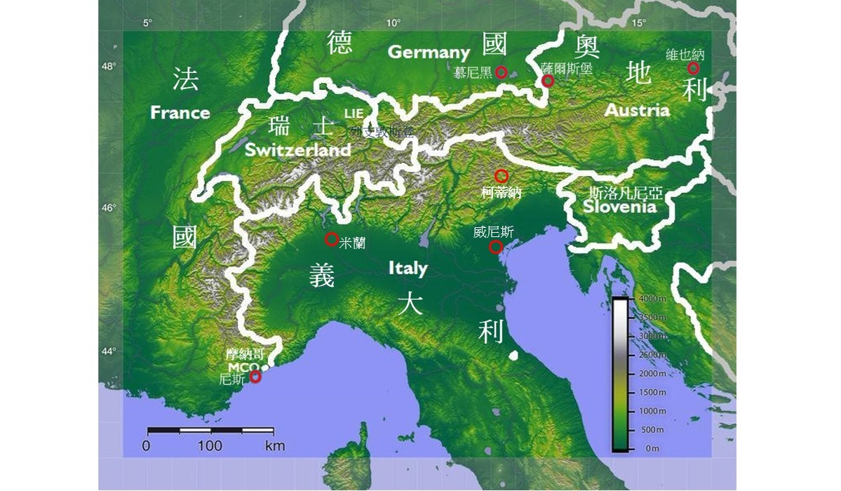 ▲阿爾卑斯山地圖,西端從濱臨地中海的法國渡假勝地尼斯(Nice),及迷你小國摩納哥開始,往北往東延伸,呈新月形,經義大利北部,瑞士中、南部,列支敦斯登,再經德國南部,往奧地利中、西部,斯洛凡尼亞東北角延伸,最東端到維也納一帶。