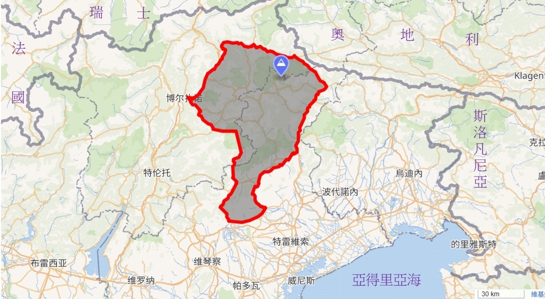 ▲多洛米堤位置地圖,面積約是台灣的40%。