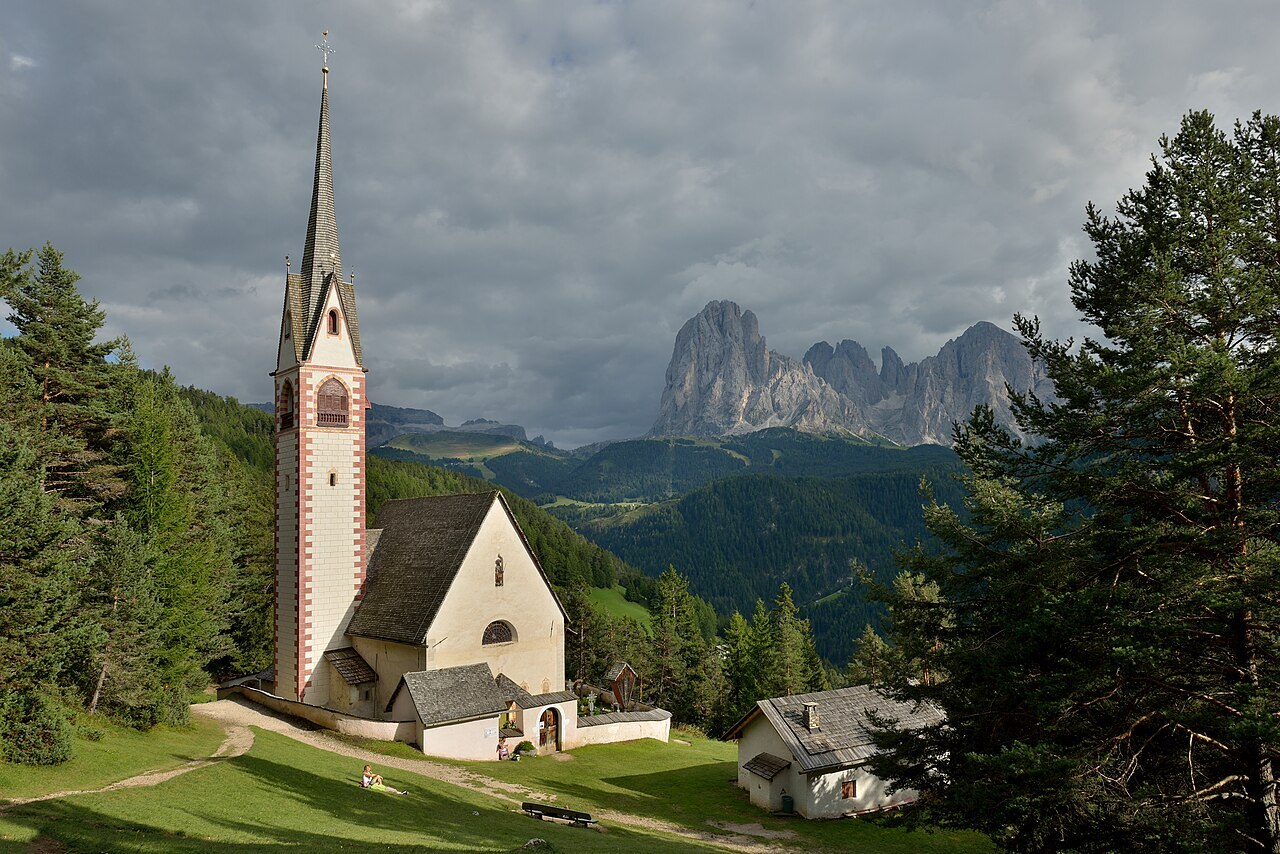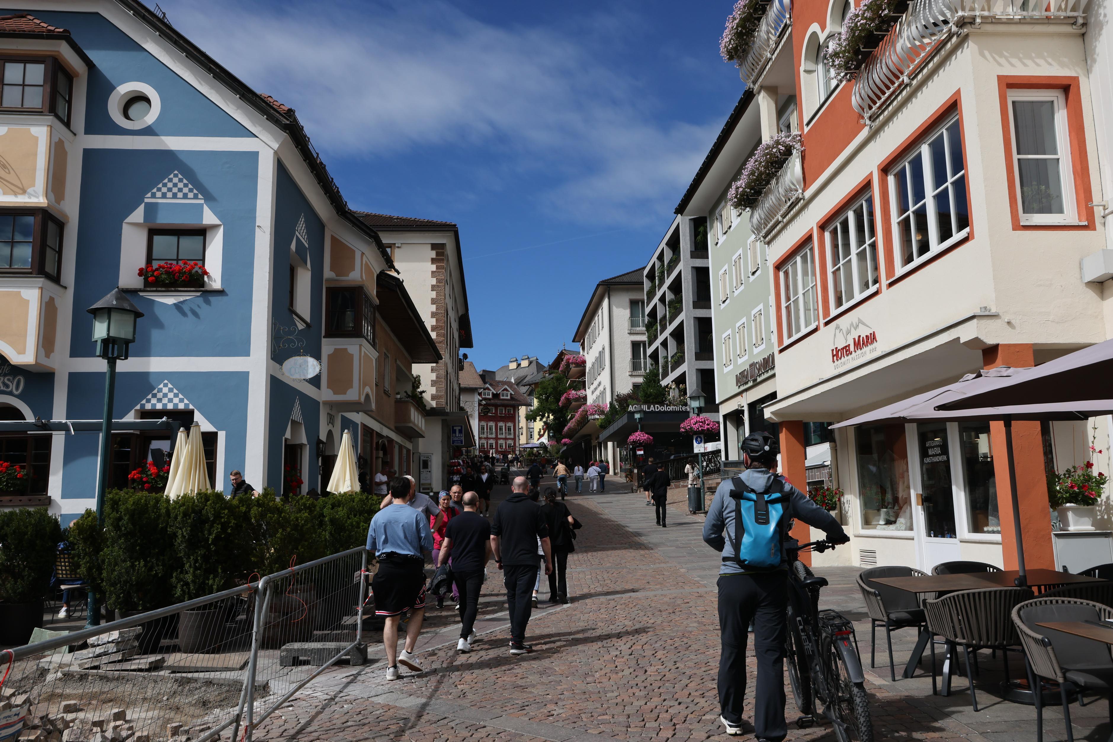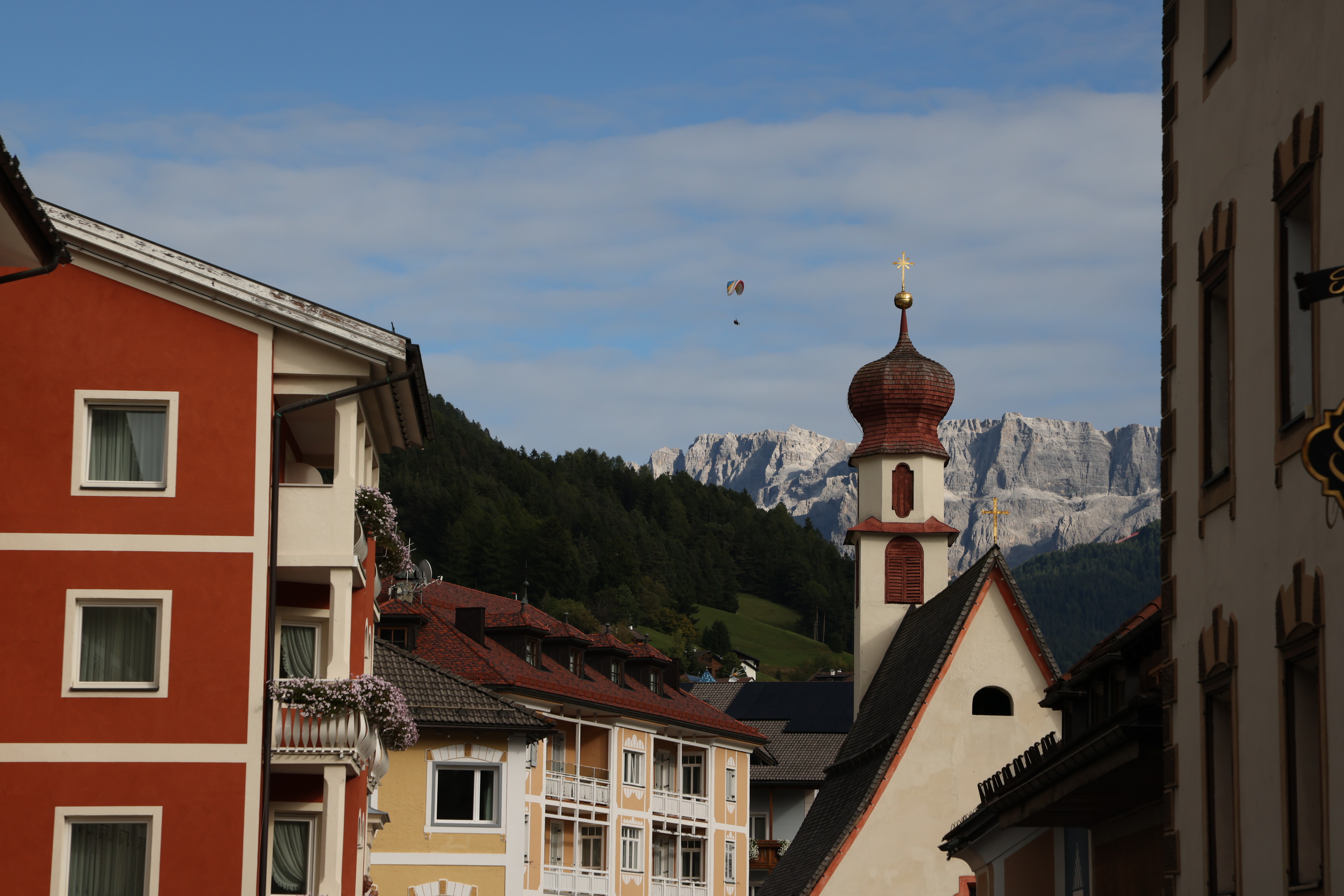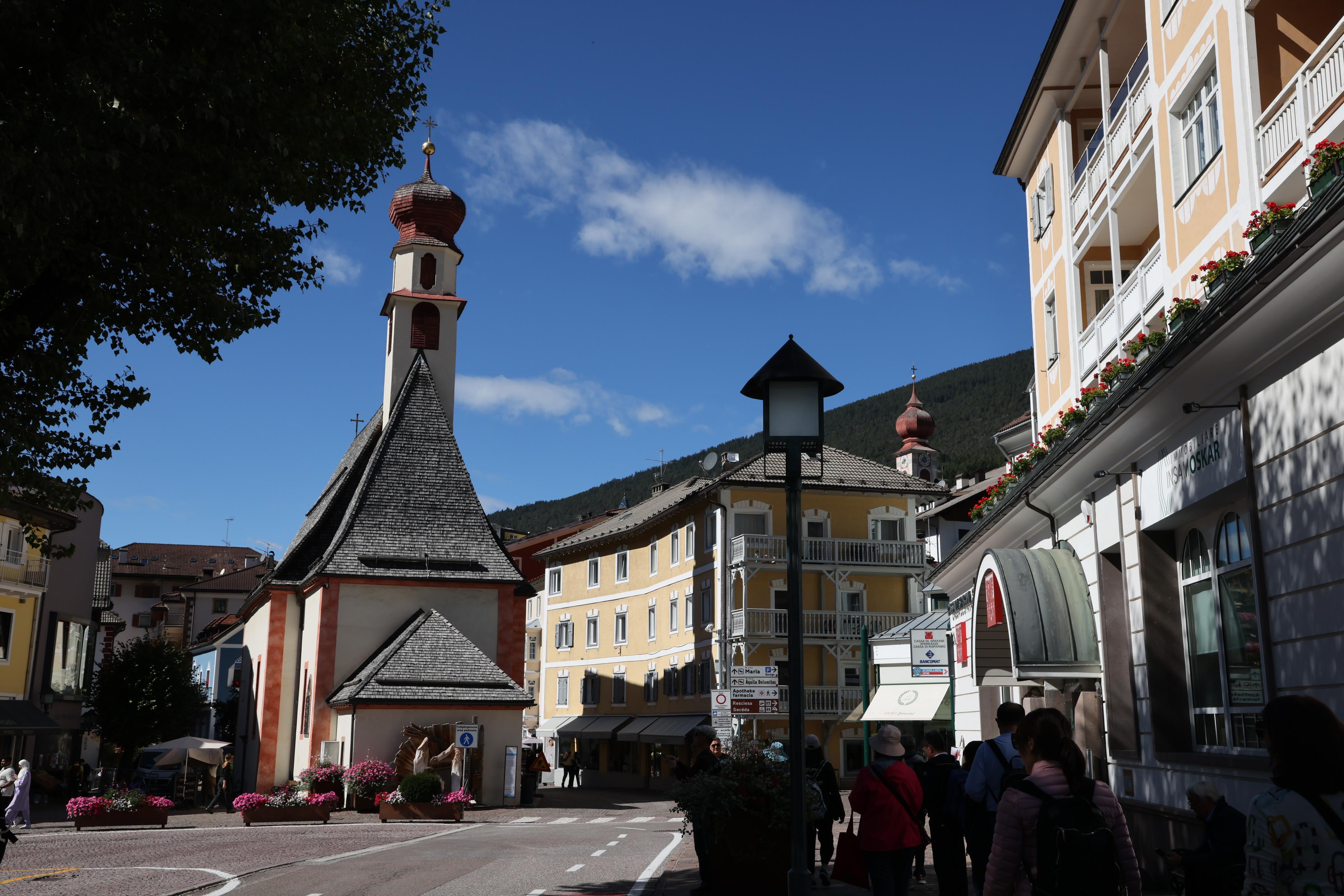 街道盡頭的教堂鐘樓,其實是天主教教堂,但卻有個像東正教教堂的洋蔥尖頂,在不同色彩的建築之間,靜靜矗立,鐘聲彷彿收攏了午後的陽光。視線越過屋瓦,遠處濯濯的多洛米堤山峰,在蔚藍的天空下展開,嶙峋岩壁冷冽而清晰。一頂五彩飛行傘緩緩滑過,像替山城添上一筆輕盈的註腳。此刻只想放慢腳步,讓色彩、山風與思緒一同沉澱,買了根卷桶冰淇淋,邊走邊吃,任浪漫在不經意間悄悄流過,一個愜意的午後。