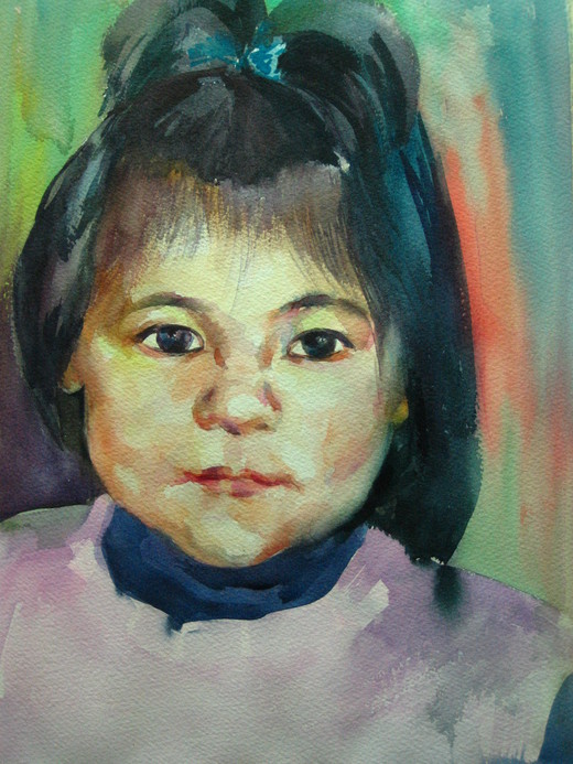 因為跑堂教學的關係,與多少學生擦肩而過已屬不清了。為要有更多時間做自己的事,今年工作室開始畫畫的招生,有一次課程內容,學生帶來自己的肖像,這位濃眉秀麗的小女孩,帶來她約莫五歲時的相片,看來聰明成穩,有種超齡的眼神,卻又惹人疼愛,我以水彩畫表達她認真的模樣,也是作為師生情誼的紀念。