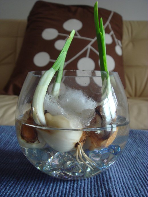 話說,那天經過一家花店,見到了花店的老闆,也許就像緣分,他看起來真是和藹可親、慈眉善目,這時我想水仙花莖已向我招手。(到底是人,還是那長的像發了牙的蒜頭的水仙花莖吸引我呢?