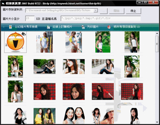 軟體簡介: 輕鬆收集網路相簿圖片。在您瀏覽網路相簿圖片的同時,自動在背景幫您收集圖片並存放到指定的目錄中。擺脫批次下載軟體被封鎖,按右鍵另存新檔,按到手抽筋的困擾。(IE適用) 使用方式: 1.啟動【相簿抓抓樂】。 2.點選[開始]按鈕。 3.依平常的習慣使用IE瀏覽網路相簿即可。 在您瀏覽網路相簿圖片的同時,【相簿抓抓樂】會自動在背景幫您收集圖片並存放到指定的目錄中。 4.點選[停止]按鈕。