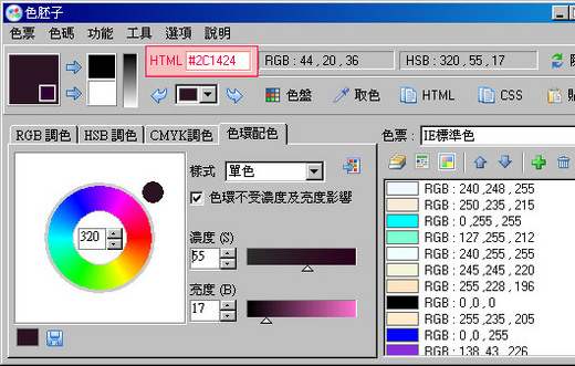 軟體簡介:色胚子是一套輔助配色的工具軟體,提供電腦最常用的 RGB 調色及最適合人類直覺的 HSB 調色、色環調色模式及多種配色輔助工具,且支援多種色碼格式的複製與貼上,並可匯出、匯入多種色票格式,方便與各類型影像處理軟體、網頁共通顏色,在網頁色彩方面亦提供網頁 216 安全色色盤及自動檢測網頁安全色的功能,而便利的色票管理功能更可幫助使用者管理調配好的顏色,作者也特別收集了許多色票可供直接使用。