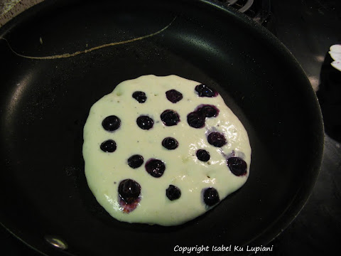 4.平底不沾鍋中小火預熱. 用量杯舀1/3杯的麵糊入鍋, 稍微用湯匙勻開成圓形, 灑上藍莓, 用手指將藍莓輕壓入麵糊. 煎約1:45至2分鐘(麵糊會有小泡泡), 翻面續煎約1:30.