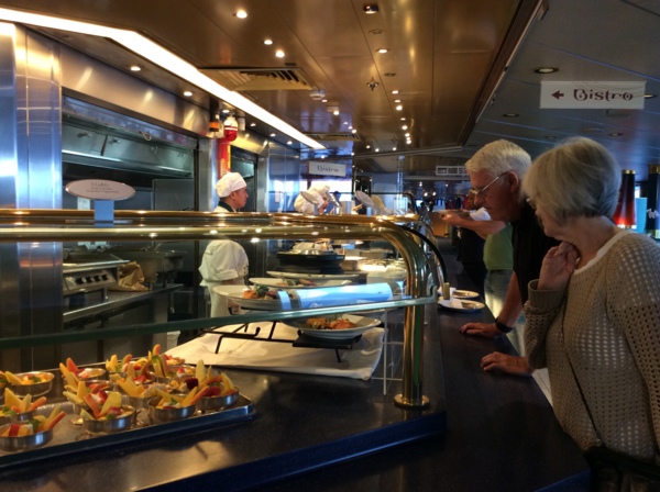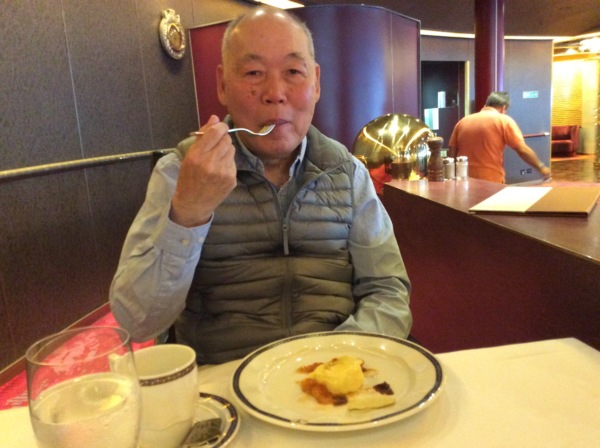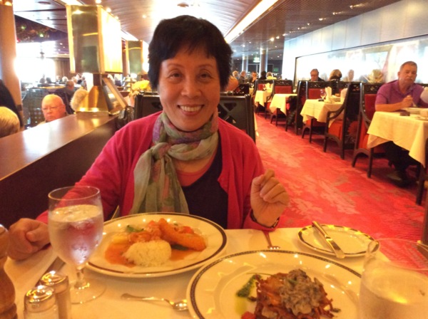 看過日出,回到房间,便和秋香一起上麗都餐廳吃早點。我們一定會找個靠窗的桌子,一邊看海,一邊享用豐盛的早點。這艘船的自助早餈,有美式的、英式的,還有一個角落專門提供亞洲食物。只是那稀飯又濃又鹹,遠不能和台湾相比。早餐的水果台,樣數多而品質好,「阿慶」迄今忘不了的是那超市上買不到的,如雞蛋大的草莓,吃起來香甜汁多,如同到了天堂一般。