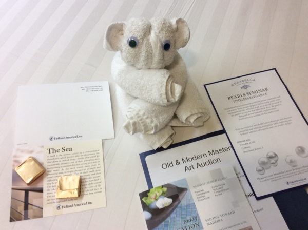 回到再次被整理過後的房间,欣賞一下服務人員放在床上的毛巾動物造型,並阅讀一下次日船上的活動简報,然後便帶上相機到環船的廊道上散步及欣賞日落。 落日是一天中最美的天象,即使太陽落到海平面以下,那看不到太陽的晚霞更是醉人。這時刻總會發現,愛攝影的不只「阿慶」一人。有一次和來自加州的遊客相互討論及欣賞作品,還學了幾招技巧,深感人生真是學無止境啊。