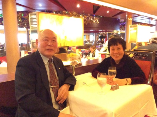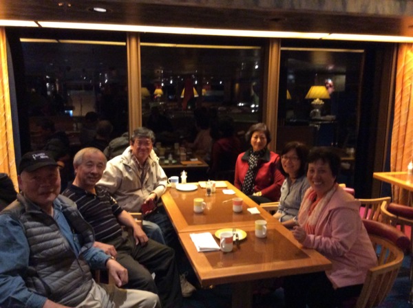 乘客中,東方面孔的並不很多,因而在初次碰面時,常常會打個招呼互問來自何方。此次航程中榮幸地碰到兩對曾經在台湾生活過的華裔夫婦,或許是有着共同的文化背景,幾乎每晚都會在人数不多的古典音樂室碰到,大家都有著他鄉遇故知的喜悅。有幾個晚上,還意猶未盡地移師到頂層的麗都餐廳,繼續喝茶聊天到深夜。