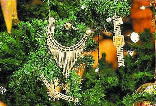 聖誕樹,樹上裝飾大批珠寶飾品(下,小圖)。