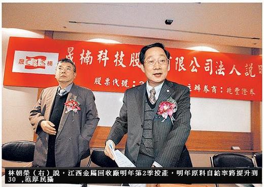看好金屬需求並強化垂直整合,林朝榮表示,積極擴展以有色金屬錫為主的金屬資源回收及原料提煉製成,在中國江西省政府協助下,晟楠是目前唯一取得中國金屬回收執照的外資企業。
