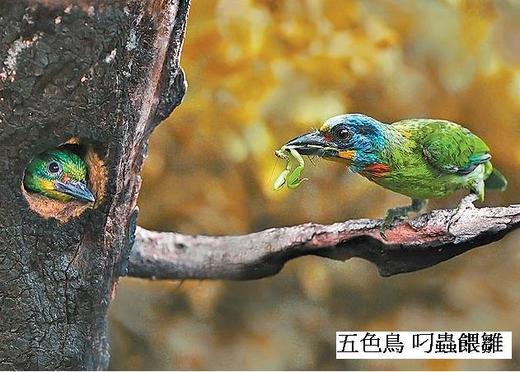 五色鳥除了有繽紛的外型,在習性上也和啄木鳥一樣,選定枯朽樹木後,會啄樹洞築巢,孕育下一代,母鳥每次下蛋約3至5枚,雛鳥孵化後,母鳥會忙碌地叼小昆蟲進洞餵食。圖中樹洞內的小鳥就是雛鳥,叼小蟲者為成鳥。除了小蟲,五色鳥平常的食物來源也包括樹的種子。文╱施春美