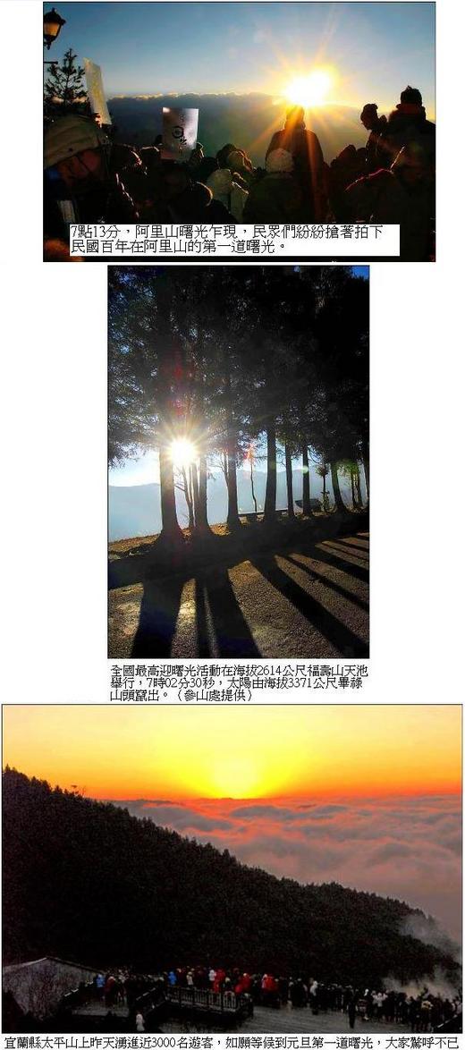 搶見民國百年第一道日光,全台熱門迎曙光的景點都擠滿熱情民眾,不過因為雲層過厚,台灣本島第一道曙光原本應出現在三仙台和太麻里,當地卻不見曙光。但是高山上如太平山、阿里山和福壽山上的民眾,則幸運看到雲破日出的一刻。