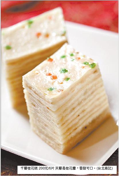而高記的鬆糕也頗有名氣,「上海鬆糕是以生粉製作,通常會將糯米粉和在來米粉依比例混合。」高記點心長張宏棋說,糯米粉太多會黏,在來米粉多則會硬,比例約6:4,口感才會Q中帶鬆。