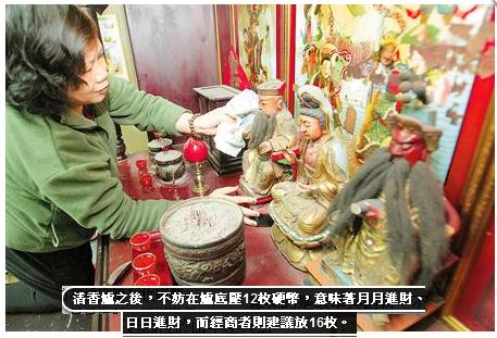 神桌香爐底下可壓著12枚硬幣,代表日日進財。
