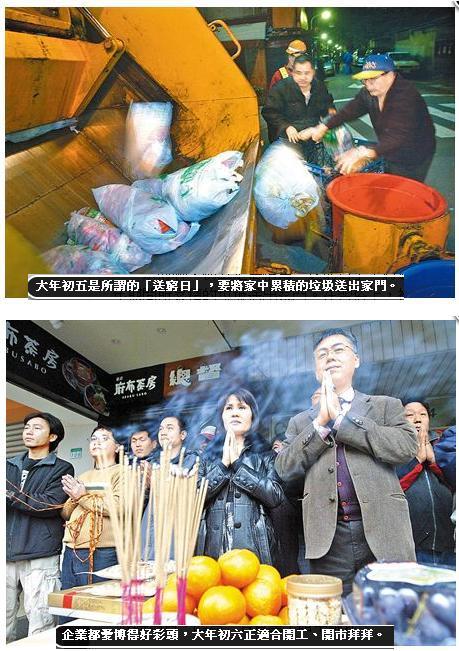 祭財神:初五是俗稱為「送窮日」,將過年期間所累積的垃圾送出家門。在習俗上,初五才是接財神的日子,不過由於為了提防給別人給接走了,於是一家比一家早,就出現了筆者前述之除夕夜的「接財神」的動作。