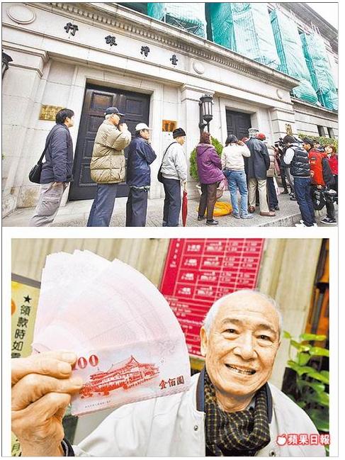 台銀等8家行庫昨開始提供新鈔兌換,今年逢建國百年,紅色百元鈔票不僅討喜應景,也因印有「慶祝建國百年」字樣,吸引民眾起個大早前往台銀總行營業部排隊(上圖)。老先生每年都習慣到台銀來換新鈔,百元新鈔準備過年發紅包給孫子用(下圖)。